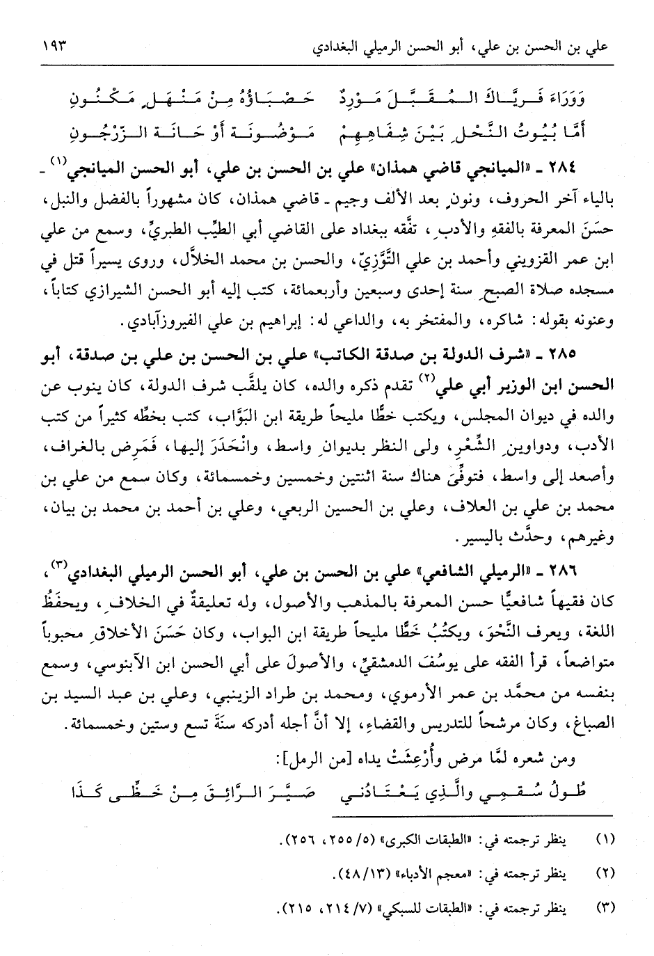 286 - الرميلي الشَّافِعِي عَليّ بن الْحسن بن عَليّ أَبُو الْحسن الرميلي الْبَغْدَادِيّ كَانَ فَقِيها شافعيا حسن الْمعرفَة بِالْمذهبِ وَالْأُصُول وَله تعليقة فِي الْخلاف ويحفظ اللُّغَة وَيعرف النَّحْو وَكتب خطا مليحا طَريقَة ابْن البواب وَكَانَ حسن الْأَخْلَاق محبوبا متواضعا قَرَأَ الْفِقْه على يُوسُف الدِّمَشْقِي وَالْأُصُول على أبي الْحسن ابْن الآبنوسي وَسمع بِنَفسِهِ من مُحَمَّد بن عمر الأرموي وَمُحَمّد بن طراد الزَّيْنَبِي وَعلي بن عبد السَّيِّد بن الصّباغ وَكَانَ مرشحا للتدريس وَالْقَضَاء إِلَّا أَن أَجله أدْركهُ سنة تسع وَسِتِّينَ وَخَمْسمِائة وَمن شعره لما مرض وأرعشت يَدَاهُ // (من الرمل) //