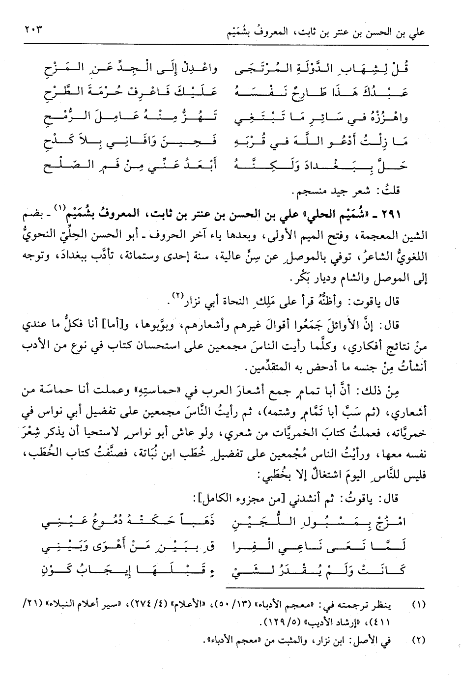 291 - شميم الْحلِيّ عَليّ بن الْحسن بن عنتر بن ثَابت الْمَعْرُوف بشميم بِضَم الشين الْمُعْجَمَة وَفتح الْمِيم الأولى وَبعدهَا يَاء آخر الْحُرُوف أَبُو الْحسن الْحلِيّ النَّحْوِيّ اللّغَوِيّ الشَّاعِر توفّي بالموصل عَن سنة عالية سنة إِحْدَى وسِتمِائَة تأدب بِبَغْدَاد وَتوجه إِلَى الْموصل وَالشَّام وديار بكر قَالَ ياقوت وَأَظنهُ قَرَأَ على ملك النُّحَاة أبي نزار قَالَ إِن الْأَوَائِل جمعُوا أَقْوَال غَيرهم وأشعارهم وبوبوها وَأما أَنا فَكل مَا عِنْدِي من نتائج أفكاري وَكلما رَأَيْت النَّاس مُجْمِعِينَ على اسْتِحْسَان كتاب فِي نوع من الْأَدَب أنشأت من جنسه مَا أدحض بِهِ الْمُتَقَدِّمين من ذَلِك أَن أَبَا تَمام جمع أشعار الْعَرَب فِي حماسته وعملت أَنا حماسة من أشعاري ثمَّ سبّ أَبَا تَمام وَشَتمه ثمَّ رَأَيْت النَّاس مُجْمِعِينَ على تَفْضِيل أبي نواس فِي خمرياته فَعمِلت كتاب الخمريات من شعري وَلَو عَاشَ أَبُو نواس لاستحيا أَن يذكر شعر نَفسه مَعهَا وَرَأَيْت النَّاس مُجْمِعِينَ على تَفْضِيل خطب ابْن نَبَاته فصنفت كتاب الْخطب فَلَيْسَ النَّاس الْيَوْم اشْتِغَال إِلَّا بخطبي قَالَ ياقوت ثمَّ أَنْشدني // (من مجزوء الْكَامِل) //