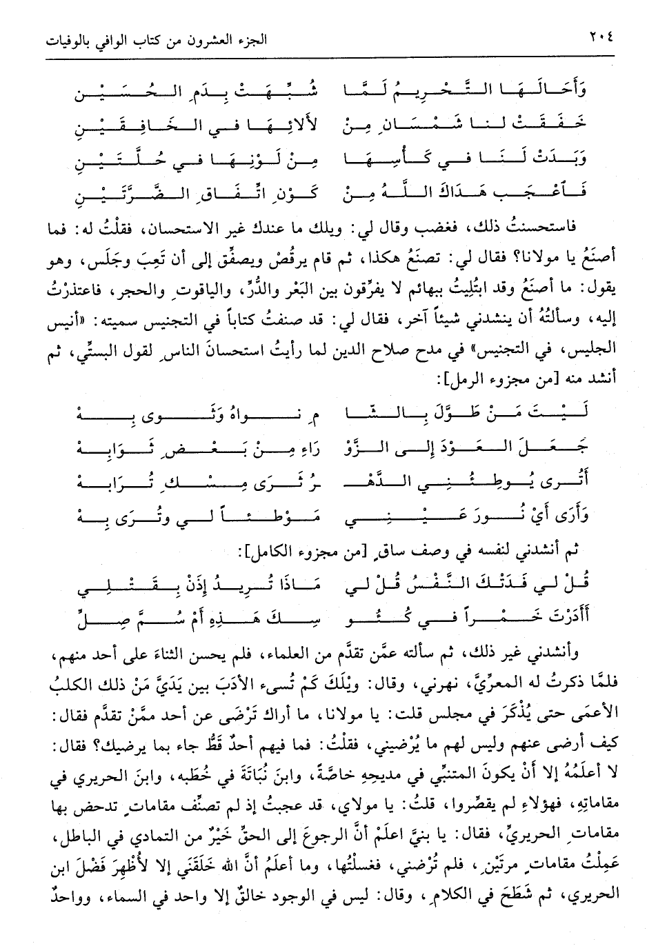 فاستحسنت ذَلِك فَغَضب وَقَالَ لي وَيلك مَا عنْدك غير الِاسْتِحْسَان فَقلت لَهُ فَمَا أصنع يَا مَوْلَانَا فَقَالَ لي تصنع هَكَذَا ثمَّ قَامَ يرقص ويصفق إِلَى أَن تَعب وَجلسَ وَهُوَ يَقُول أصنع وَقد ابْتليت ببهائم لَا يفرقون بَين البعر والدر والياقوت وَالْحجر فاعتذرت إِلَيْهِ وَسَأَلته أَن ينشدني شَيْئا آخر فَقَالَ لي قد صنفت كتاب فِي التَّجْنِيس سميته أنيس الجليس فِي التَّجْنِيس فِي مدح صَلَاح الدّين لم رَأَيْت اسْتِحْسَان النَّاس لقَوْل البستي ثمَّ أنْشد مِنْهُ // (من مجزوء الْكَامِل) //