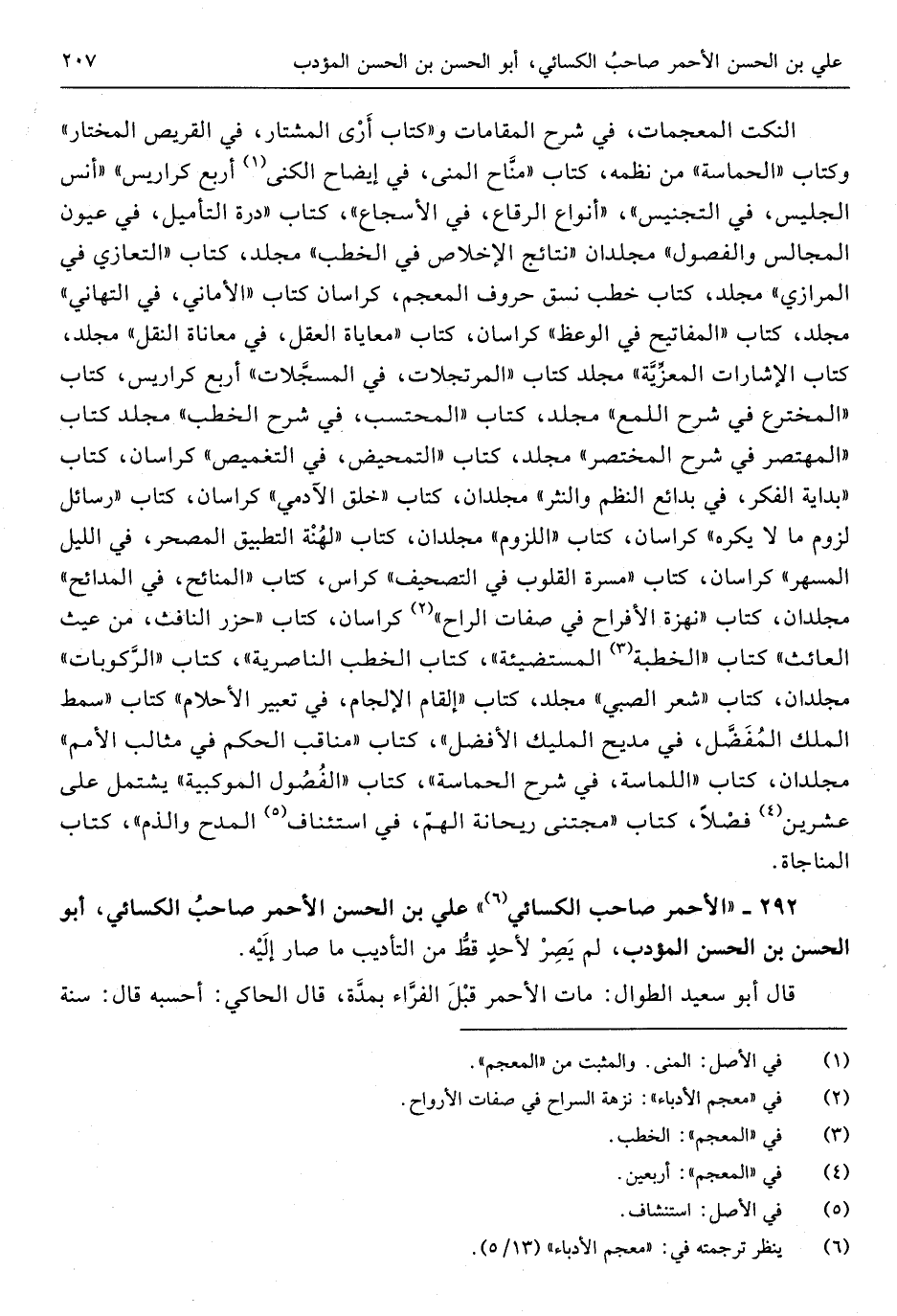 292 - الْأَحْمَر صَاحب الْكسَائي عَليّ بن الْحسن الْأَحْمَر صَاحب الْكسَائي أَبُو الْحسن بن الْحسن الْمُؤَدب لم يصر لأحد قطّ من التَّأْدِيب مَا صَار إِلَيْهِ قَالَ أَبُو سعيد الطوَال مَاتَ الْأَحْمَر قبل الْفراء بِمدَّة قَالَ الحاكي أَحْسبهُ قَالَ سنة