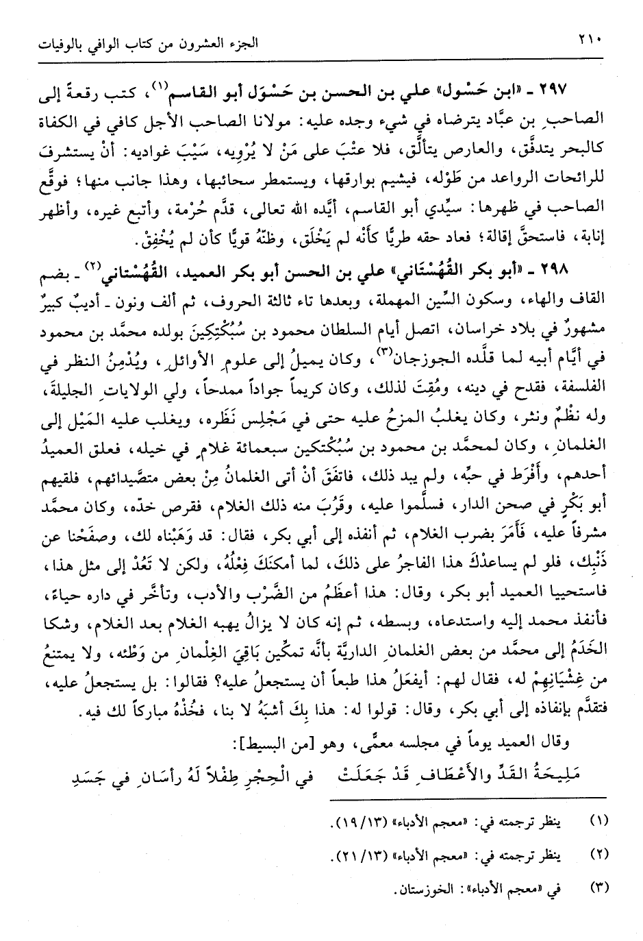 298 - أَبُو بكر الْقُهسْتَانِيّ عَليّ بن الْحسن أَبُو بكر العميد الْقُهسْتَانِيّ بِضَم الْقَاف وَالْهَاء وَسُكُون السِّين الْمُهْملَة وَبعدهَا تَاء ثَالِثَة الْحُرُوف ثمَّ ألف وَنون أديب كَبِير مَشْهُور فِي بِلَاد خُرَاسَان اتَّصل أَيَّام الْملك مَحْمُود بن سبكتكين بولده مُحَمَّد بن مَحْمُود فِي أَيَّام أَبِيه لما قَلّدهُ الجوزان وَكَانَ يمِيل إِلَى عُلُوم الْأَوَائِل ويدمن النّظر فِي الفلسفة فقدح فِي دينه ومقت لذَلِك وَكَانَ كَرِيمًا جوادا ممدحا ولي الولايات الجليلة وَله نظم ونثر وَكَانَ يغلب المزح عَلَيْهِ حَتَّى فِي مجْلِس نظره ويغلب عَلَيْهِ الْميل إِلَى الغلمان وَكَانَ لمُحَمد بن مَحْمُود بن سبكتيكين سَبْعمِائة غُلَام فِي خيله فعلق العميد أحدهم وأفرط فِي حبه وَلم يبد ذَلِك فاتفق أَن أَتَى الغلمان من بعض متصيدائهم فَلَقِيَهُمْ أَبُو بكر فِي صحن الدَّار فَسَلمُوا عَلَيْهِ وَقرب مِنْهُ ذَلِك الْغُلَام فقرص خَدّه وَكَانَ مُحَمَّد مشرفا عَلَيْهِ فَأمر بِضَرْب الْغُلَام ثمَّ أنفذه إِلَى أبي بكر فَقَالَ قد وهبناه لَك وصفحنا عَن ذَنْبك فَلَو لم يساعدك هَذَا الْفَاجِر على ذَلِك لما أمكنك فعله وَلَكِن لَا تعد إِلَى مثل هَذَا فاستحييا العميد أَبُو بكر وَقَالَ هَذَا أعظم من الضَّرْب وَالْأَدب وَتَأَخر فِي دَاره حَيَاء فأنفذ مُحَمَّد إِلَيْهِ واستدعاه وَبسطه ثمَّ انه كَانَ لَا يزَال يَهبهُ الْغُلَام بعد الْغُلَام وشكا الخدم إِلَى مُحَمَّد من بغض الغلمان الدارية بِأَنَّهُ تَمْكِين بَاقِي الغلمان من وَطئه وَلَا يمْتَنع من غشيانهم لَهُ فَقَالَ لَهُم أيفعل هَذَا طبعا أَن يستعجل عَلَيْهِ فَقَالُوا بل يستعجل عَلَيْهِ فَتقدم بإنفاذه إِلَى أبي بكر وَقَالَ قُولُوا لَهُ هَذَا بك أشبه لَا بِنَا فَخذه مُبَارَكًا لَك فِيهِ وَقَالَ العميد يَوْمًا فِي مَجْلِسه معمى وَهُوَ // (من الْبَسِيط) //