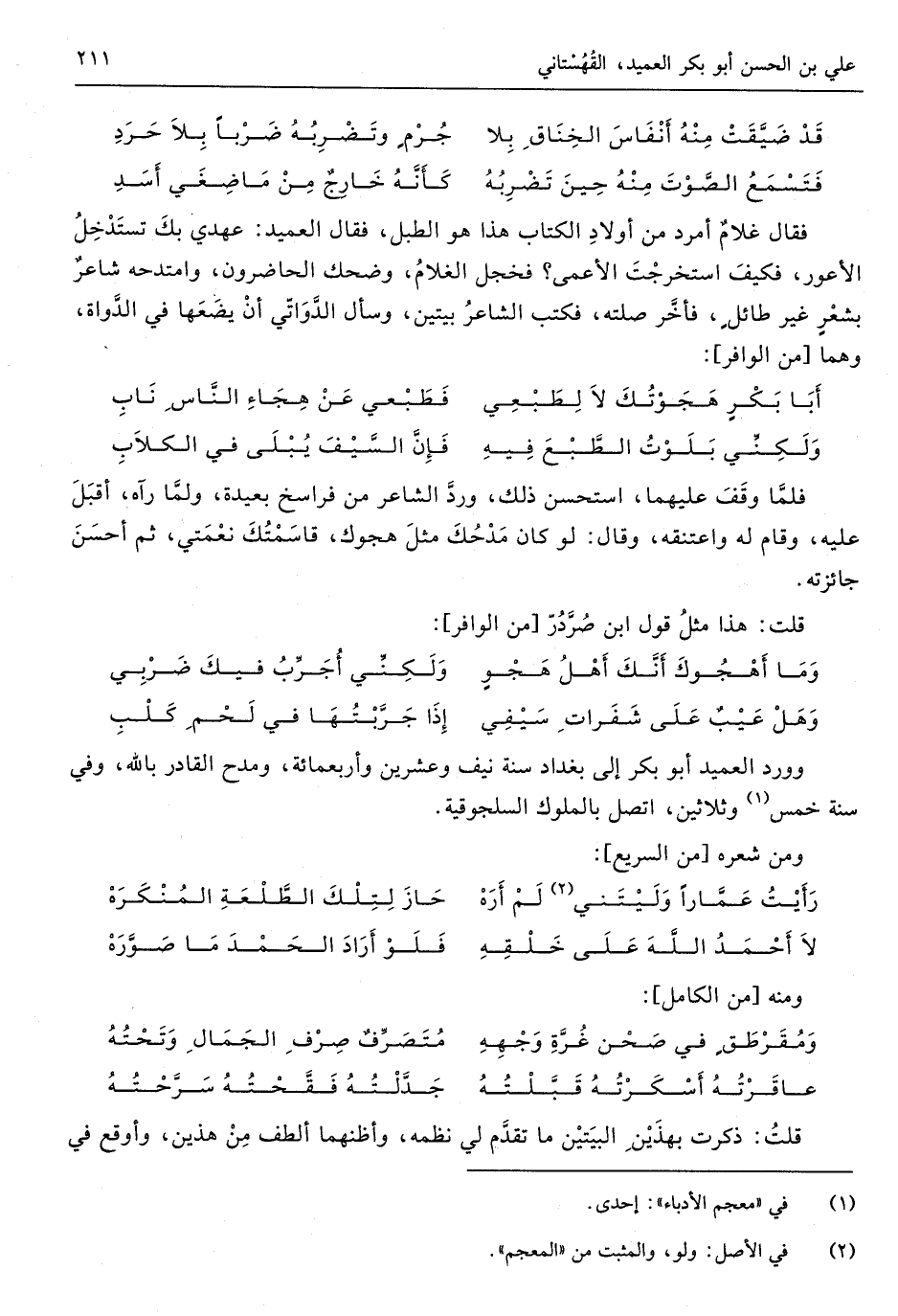 وَورد العميد أَبُو بكر إِلَى بَغْدَاد سنة ينف وَعشْرين وَأَرْبَعمِائَة ومدح الْقَادِر بِاللَّه وَفِي سنة خمس وَثَلَاثِينَ اتَّصل بالملوك السلجوقية وَمن شعره // (من السَّرِيع) //