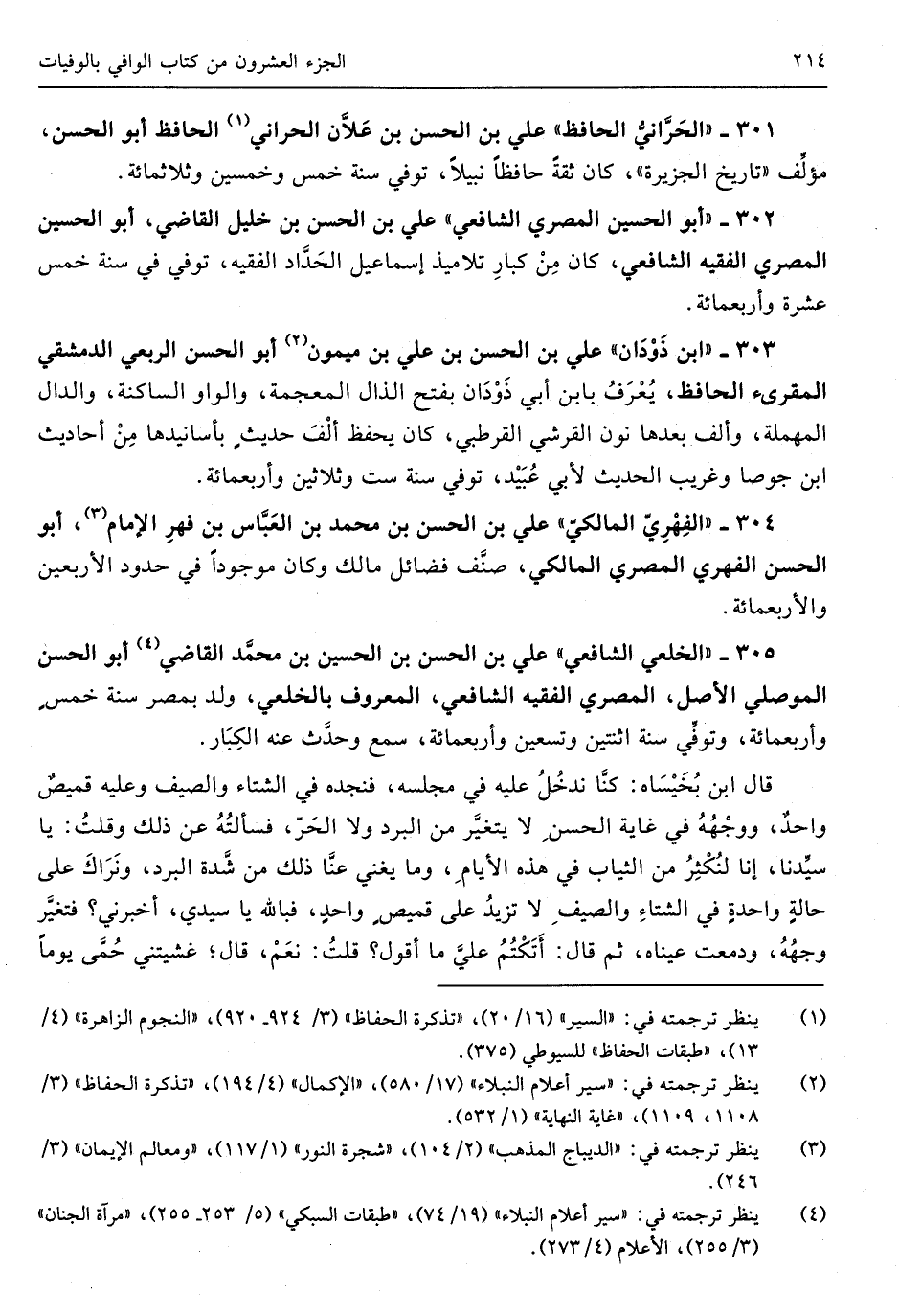 301 - الْحَرَّانِي الْحَافِظ عَليّ بن الْحسن بن عَلان الْحَرَّانِي الْحَافِظ أَبُو الْحسن مؤلف تَارِيخ الجزيرة كَانَ ثِقَة حَافِظًا نبيلا توفّي سنة خمس وَخمسين وثلاثمائة