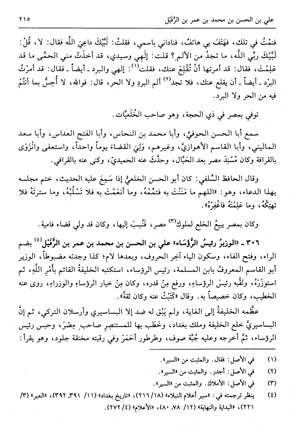 306 - الْوَزير رَئِيس الرؤساء عَليّ بن الْحسن بن مُحَمَّد بن عمر بن الرفيل بِضَم الرَّاء وَفتح الْفَاء وَسُكُون الْيَاء آخر الْحُرُوف وَبعدهَا لَام كَذَا وجدته مضبوطا الْوَزير أَبُو الْقَاسِم بِالْمَعْرُوفِ بن الْمسلمَة رَئِيس الرؤساء اسْتَكْتَبَهُ الْخَلِيفَة الْقَائِم بِأَمْر الله ثمَّ استوزره ولقبه رَئِيس الرؤساء وَرفع من قدره وَكَانَ من خِيَار الرؤساء والوزراء روى عَنهُ الْخَطِيب وَكَانَ خصيصا بِهِ وَقَالَ كتبت عَنهُ وَكَانَ ثِقَة عظمه الْخَلِيفَة إِلَى الْغَايَة وَلم يبْق لَهُ ضد إِلَّا البساسيري وأرسلان التركي ثمَّ إِن البساسيري خلع الْخَلِيفَة وَملك بَغْدَاد وخطب بهَا للمستنصر صَاحب مصر وَحبس رَئِيس الرؤساء ثمَّ أخرجه وَعَلِيهِ جُبَّة صوف وطرطور أَحْمَر وَفِي رقبته مخنقة جُلُود وَهُوَ يقْرَأ