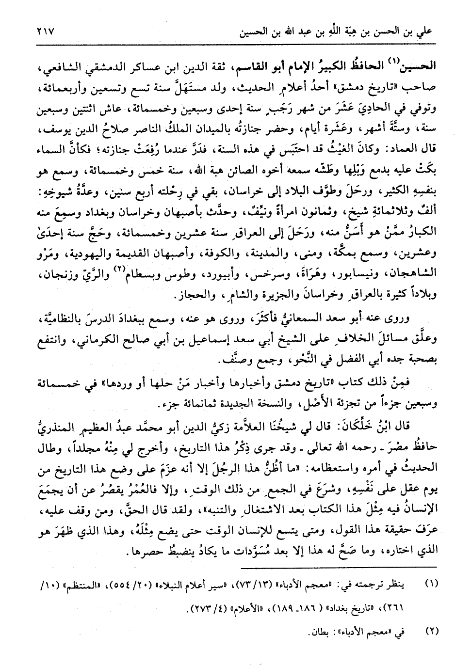 الْحُسَيْن الْحَافِظ الْكَبِير الْأَمَام أَبُو الْقَاسِم ثِقَة الدّين ابْن عَسَاكِر الدِّمَشْقِي الشَّافِعِي صَاحب تَارِيخ دمشق أحد أَعْلَام الحَدِيث ولد مستهل سنة تسع وَتِسْعين وَأَرْبَعمِائَة وَتُوفِّي فِي الْحَادِي عشر من شهر رَجَب سنة إِحْدَى وَسبعين وَخَمْسمِائة عَاشَ اثْنَتَيْنِ وَسبعين سنة وَسِتَّة أشهر وَعشرَة أَيَّام وَحضر جنَازَته بالميدان الْملك النَّاصِر صَلَاح الدّين يُوسُف قَالَ الْعِمَاد وَكَانَ الْغَيْث احْتبسَ فِي هَذِه السّنة فدر عِنْدَمَا رفعت جنَازَته فَكَأَن السَّمَاء بَكت عَلَيْهِ بدمع وبلها وطشه أَخُوهُ الصائن هبة الله سنة خمس وَخَمْسمِائة وَسمع هُوَ بِنَفسِهِ الْكثير ورحل وطوف الْبِلَاد إِلَى خُرَاسَان بَقِي فِي رحلته أَربع سِنِين وعدة شُيُوخه ألف وثلاثمائة شيخ وَثَمَانُونَ امْرَأَة ونيف وَحدث بأصبهان وخراسان وبغداد وَسمع مِنْهُ الْكِبَار مِمَّن هُوَ أسن مِنْهُ ورحل إِلَى الْعرَاق سنة عشْرين وَخَمْسمِائة وَحج سنة إِحْدَى وَعشْرين وَسمع بِمَكَّة وَمنى وَالْمَدينَة والكوفة وأصبهان الْقَدِيمَة واليهودية ومرو الشاهجان ونيسابور وهراة وسرخس وأبيورد وطوس وبسطام والري وزنجان وبلادا كَثِيرَة بالعراق وخراسان والجزيرة وَالشَّام والحجاز وروى عَنهُ أَبُو سعد السَّمْعَانِيّ فَأكْثر وروى هُوَ عَنهُ وَسمع بِبَغْدَاد الدَّرْس بالنظامية وعلق مسَائِل الْخلاف على الشَّيْخ أبي سعد إِسْمَاعِيل بن أبي صَالح الكرمان وانتفع بِصُحْبَة جده أبي الْفضل فِي النَّحْو وَجمع وصنف فَمن ذَلِك كتاب تَارِيخ دمشق وأخبارها وأخبار من حلهَا أَو وردهَا فِي خَمْسمِائَة وسعبين جُزْءا من تجزئة الأَصْل وَالنُّسْخَة الجديدة ثَمَانمِائَة جُزْء قَالَ ابْن خلكان قَالَ لي شَيخنَا الْعَلامَة زكي الدّين أَبُو مُحَمَّد عبد الْعَظِيم الْمُنْذِرِيّ حَافظ مصر رَحمَه الله تَعَالَى وَقد جرى ذكر هَذَا التَّارِيخ وَأخرج لي مِنْهُ مجلدا وَطَالَ الحَدِيث فِي أمره واستعظامه مَا أَظن هَذَا الرجل إِلَّا أَنه عزم على وضع هَذَا التَّارِيخ من يَوْم عقل على نَفسه وَشرع فِي الْجمع من ذَلِك الْوَقْت وَإِلَّا فالعمر يقصر عَن أَن يجمع الْإِنْسَان فِيهِ مثل هَذَا الْكتاب بعد الِاشْتِغَال والتنبه وَلَقَد قَالَ الْحق وَمن وقف عَلَيْهِ عرف حَقِيقَة هَذَا القَوْل وَمَتى يَتَّسِع للْإنْسَان الْوَقْت حَتَّى يضع مثله وَهَذَا الَّذِي ظهر هُوَ الَّذِي اخْتَارَهُ وَمَا صَحَّ لَهُ هَذَا إِلَّا بعد مسودات مَا يكَاد يَنْضَبِط حصرها
