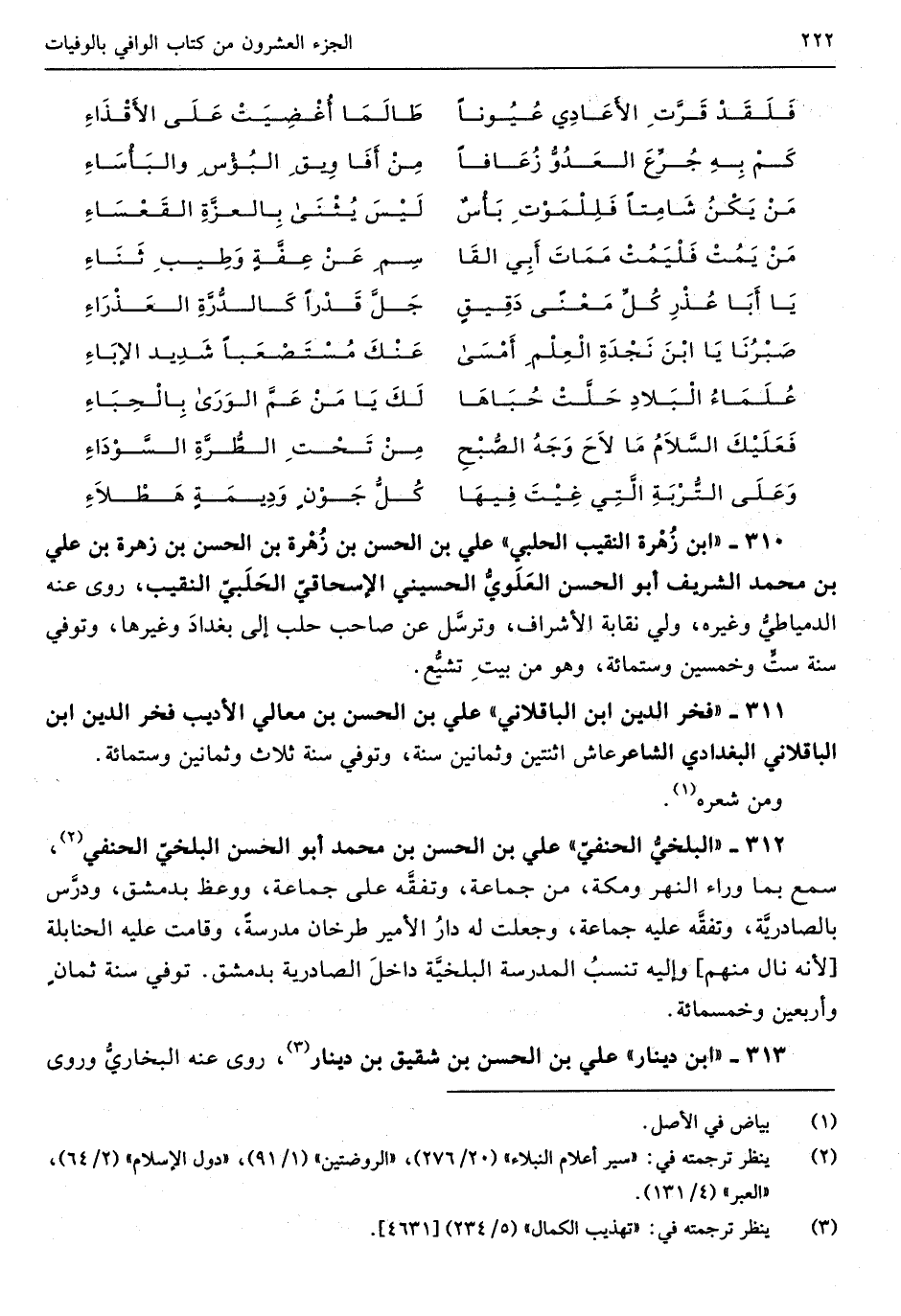 312 - الْبَلْخِي والحنفي عَليّ بن الْحسن بن مُحَمَّد أَبُو الْحسن الْبَلْخِي الْحَنَفِيّ سمع بِمَا وَرَاء النَّهر وَمَكَّة من جمَاعَة وتفقه على جمَاعَة وَوعظ بِدِمَشْق ودرس بالصادرية وتفقه عَلَيْهِ جمَاعَة وَجعلت لَهُ دَار الْأَمِير طرخان مدرسة وَقَامَت عَلَيْهِ الْحَنَابِلَة لِأَنَّهُ نَالَ مِنْهُم واليه تنْسب الْمدرسَة البلخية دَاخل الصادرية بِدِمَشْق توفّي سنة ثَمَان وَأَرْبَعين وَخَمْسمِائة