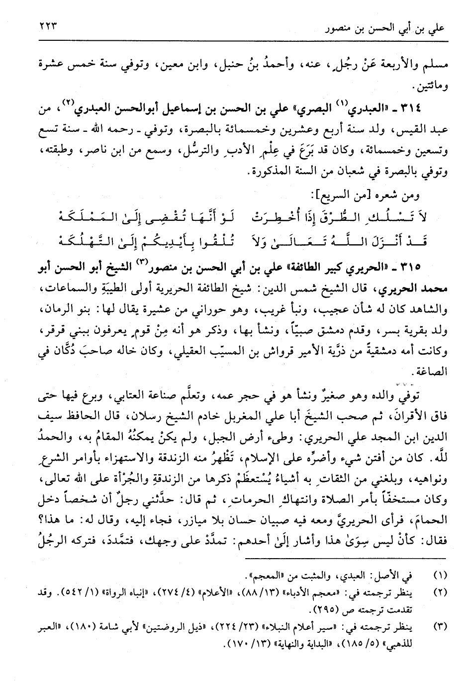 315 - الحريري كَبِير الطَّائِفَة عَليّ بن أبي الْحسن بن مَنْصُور الشَّيْخ أَبُو الْحسن أَبُو مُحَمَّد الحريري قَالَ الشَّيْخ شمس الدّين شيخ الطَّائِفَة الحريرية أولى الطّيبَة والسماعات وَالشَّاهِد كَانَ لَهُ شَأْن عَجِيب ونبأ غَرِيب وَهُوَ حوراني وَمن عشيرة يُقَال لَهَا بَنو الرُّمَّان ولد بقرية بسر وَقدم دمشقا صَبيا وَنَشَأ بهَا وَذكر انه هُوَ من قوم يعْرفُونَ ببني قرقر وَكَانَت أمه دمشقية من ذُرِّيَّة الْأَمِير قرواش بن الْمسيب الْعقيلِيّ وَكَانَ خَاله صَاحب دكان فِي الصاغة توفّي وَالِده وَهُوَ صَغِير وَنَشَأ هُوَ فِي حجر عَمه وَتعلم صناعَة العتابي وبرع فِيهَا حَتَّى فاق الأقران ثمَّ صحب الشَّيْخ أَبَا عَليّ المغربل خَادِم الشَّيْخ رسْلَان قَالَ الْحَافِظ سيف الدّين ابْن الْمجد عَليّ الحريري وطئ أَرض الْجَبَل وَلم يكن يُمكنهُ الْمقَام بِهِ وَالْحَمْد لله كَانَ من أفتن شيئ وأضره على الْإِسْلَام تظهر مِنْهُ الزندقة والاستهزاء بأوامر الشَّرْع ونواهيه وَبَلغنِي من الثِّقَات بِهِ أَشْيَاء يستعظم ذكرهَا من الزندقة والجرأة على الله تَعَالَى وَكَانَ مستخفا بِأَمْر الصَّلَاة وانتهاك الحرمات ثمَّ قَالَ حَدثنِي رجل أَن شخصا دخل الْحمام فَرَأى الحريري وَمَعَهُ فِيهِ صبيان حسان بِلَا ميازر فجَاء إِلَيْهِ وَقَالَ مَا هَذَا فَقَالَ كَأَن لَيْسَ سوى هَذَا وَأَشَارَ إِلَى أحدهم تمدد على وَجهك فتمدد فَتَركه الرجل