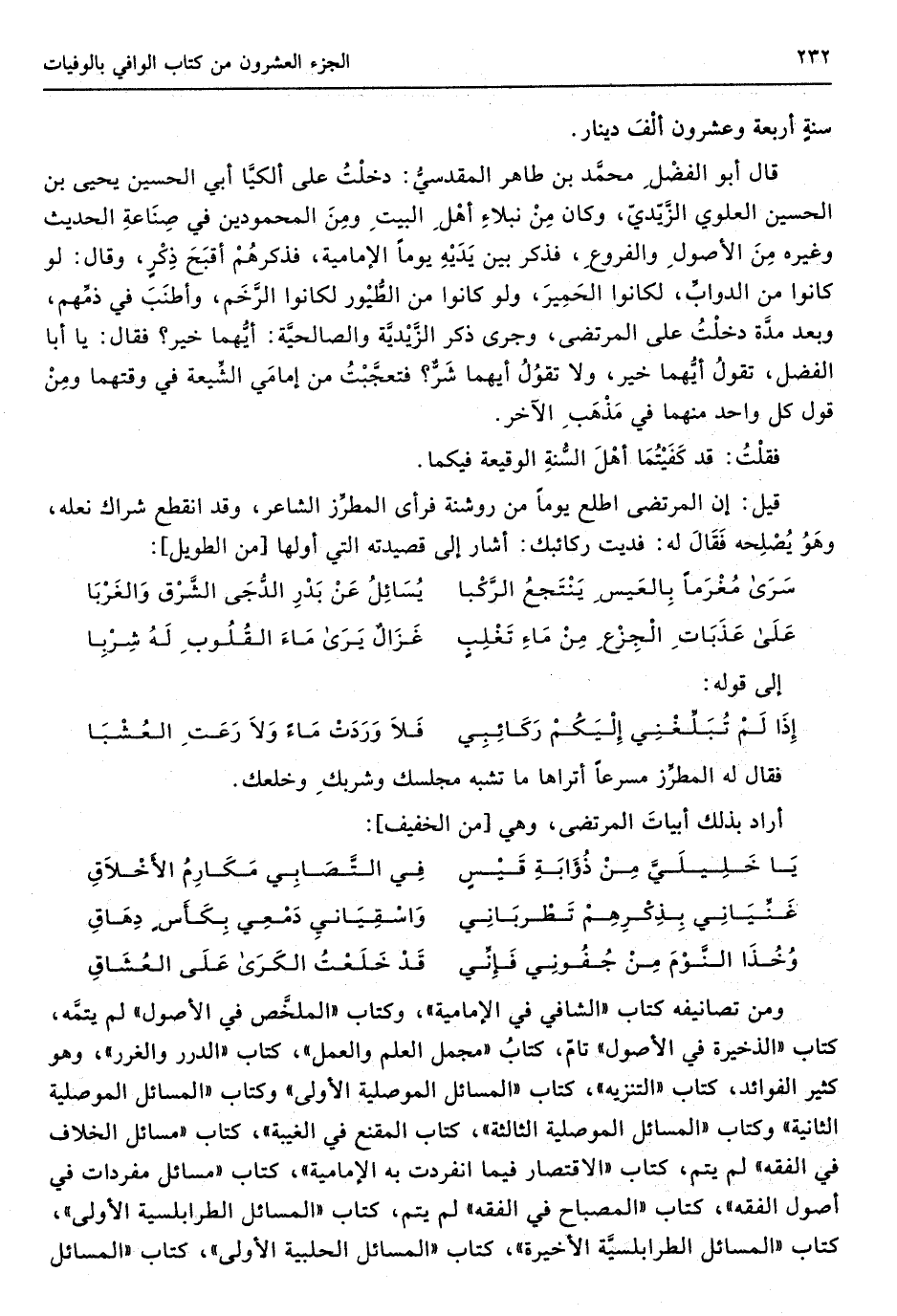 سنة سَبْعَة وَعِشْرُونَ ألف دِينَار قَالَ أَبُو الْفضل مُحَمَّد بن طَاهِر الْمَقْدِسِي دخلت على الكيا أبي الْحُسَيْن يحيى بن الْحُسَيْن الْعلوِي الزيدي وَكَانَ من نبلاء أهل الْبَيْت وَمن المحمودين فِي صناعَة الحَدِيث وَغَيره من الْأُصُول وَالْفُرُوع فَذكر بَين يَدَيْهِ يَوْمًا الإمامية فَذكرهمْ أقبح ذكر وَقَالَ لَو كَانُوا من الدَّوَابّ لكانوا الْحمير وَلَو كَانُوا من الطُّيُور لكانوا الرخم وَأَطْنَبَ فِي ذمهم وَبعد مُدَّة دخلت على المرتضى وَجرى ذكر الزيدية والصالحية أَيهمَا خير فَقَالَ يَا أَبَا الْفضل تَقول أَيهمَا خير وَلَا تَقول أَيهمَا شَرّ فتعجبت من إمامي الشِّيعَة فِي وقتهما وَمن قَول كل وَاحِد مِنْهُمَا فِي مَذْهَب الآخر فَقلت قد كفيتما أهل السّنة الوقيعة فيكما قيل إِن المرتضى اطلع يَوْمًا من روشنه فَرَأى الْمُطَرز الشَّاعِر وَقد انْقَطع شِرَاك نَعله وَهُوَ يصلحه فَقَالَ لَهُ فديت ركائبك أَشَارَ إِلَى قصيدته الَّتِي أَولهَا // (من الطَّوِيل) //