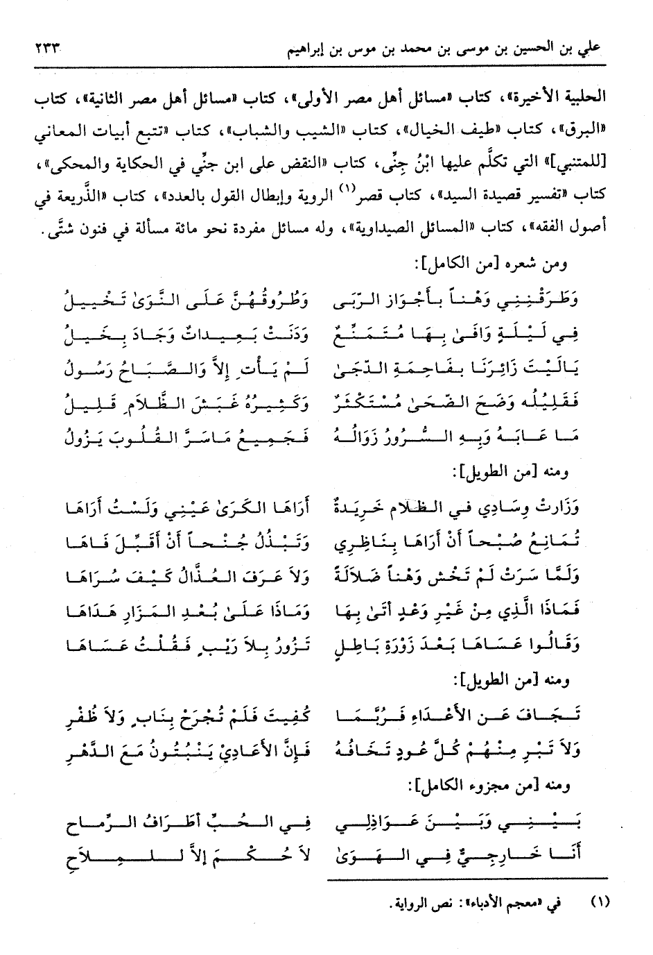 الحلبية الْأَخِيرَة كتاب مسَائِل أهل مصر الأولى كتاب أهل مصر الثَّانِيَة كتاب الْبَرْق كتاب طيف الخيال كتاب الشيب والشباب كتاب تتبع أَبْيَات الْمعَانِي للمتنبي الَّتِي تكلم عَلَيْهَا ابْن جنى كتاب النَّقْض على ابْن جني فِي الْحِكَايَة والمحكي كتاب تَفْسِير قصيدة السَّيِّد كتاب قصر الروية وَإِبْطَال القَوْل بِالْعدَدِ كتاب الذريعة فِي أصُول الْفِقْه كتاب الْمسَائِل الصيداوية وَله مسَائِل مُفْردَة نَحْو مائَة مَسْأَلَة فِي فنون شَتَّى وَمن شعره // (من الْكَامِل) //