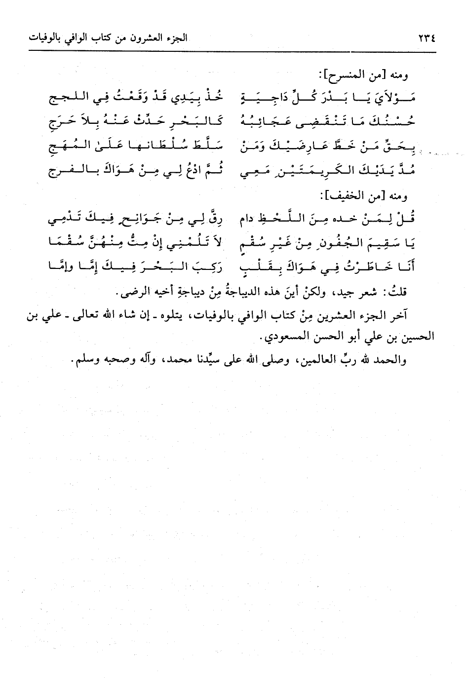 قلت شعر جيد وَلَكِن أَيْن هَذِه الديباجة من ديباجة أَخِيه الرضى آخر الْجُزْء الْعشْرين من كتاب الوافي بالوفيات يتلوه إِن شَاءَ الله تَعَالَى عَليّ بن الْحُسَيْن بن عَليّ أَبُو الْحسن المَسْعُودِيّ