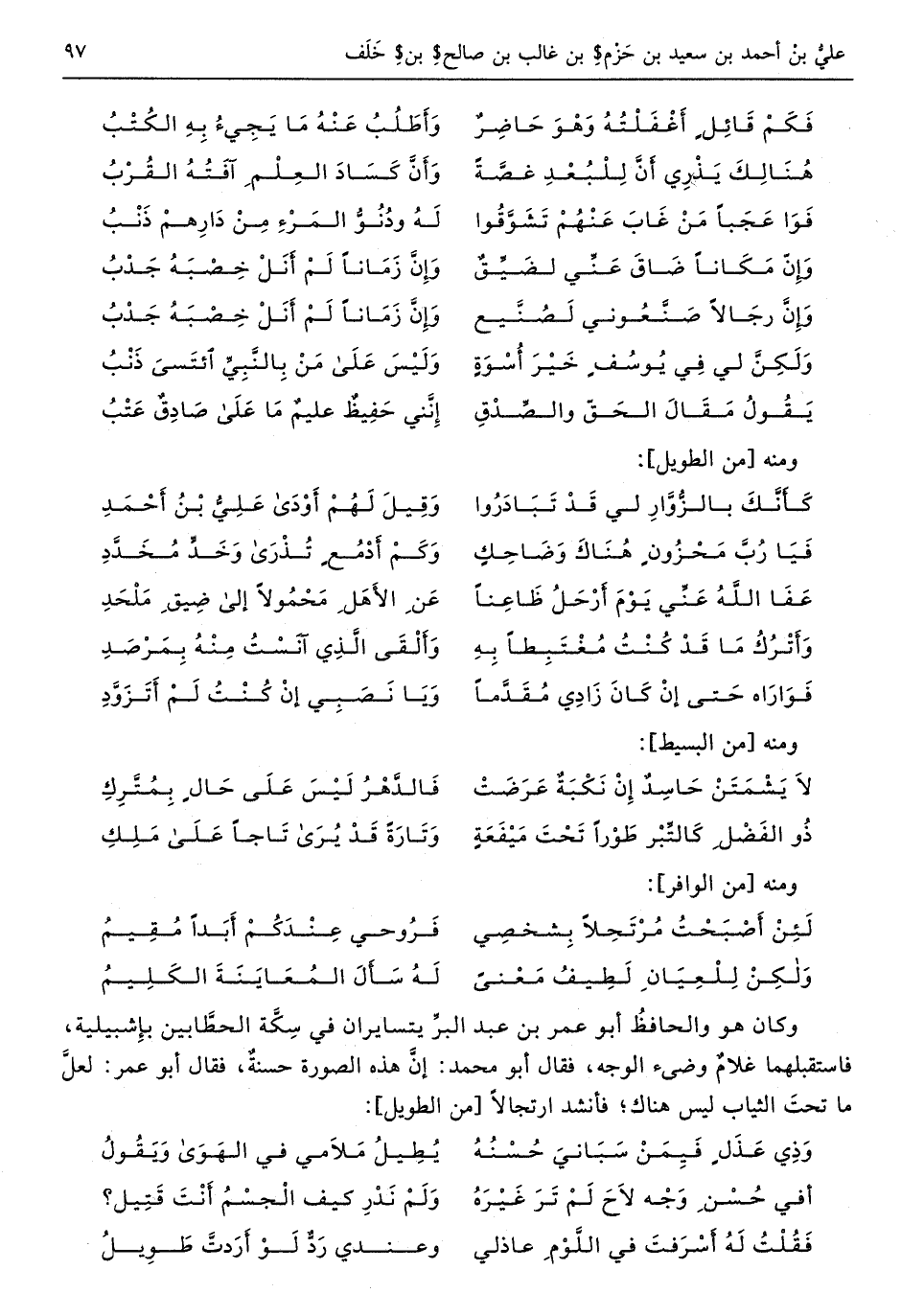 وَكَانَ هُوَ والحافظ أَبُو عمر بن عبد الْبر يتسايران فِي سكَّة الحطابين بإشبيلية فَاسْتَقْبَلَهُمَا غُلَام وضئ الْوَجْه فَقَالَ أَبُو مُحَمَّد إِن هَذِه الصُّورَة حَسَنَة فَقَالَ أَبُو عمر لَعَلَّ مَا تَحت الثِّيَاب لَيْسَ هُنَاكَ فَأَنْشد ارتجالا // (من الطَّوِيل) //