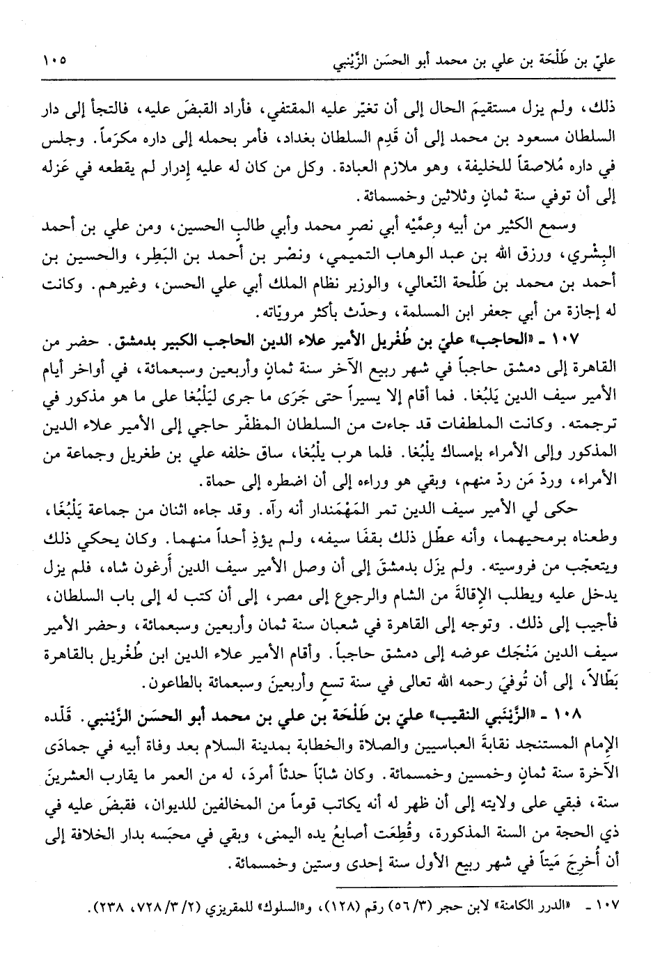 الزَّيْنَبِي النَّقِيب عَليّ بن طَلْحَة بن عَليّ بن مُحَمَّد أَبُو الْحسن الزَّيْنَبِي قَلّدهُ الإِمَام المستنجد نقابة العباسيين وَالصَّلَاة والخطابة بِمَدِينَة السَّلَام بعد وَفَاة أَبِيه فِي جُمَادَى الْآخِرَة سنة ثَمَان وَخمسين وَخمْس مائَة وَكَانَ شَابًّا حَدثا أَمْرَد لَهُ من الْعُمر مَا يُقَارب الْعشْرين سنة فَبَقيَ على ولَايَته إِلَى أَن ظهر لَهُ أَنه يُكَاتب قوما من الْمُخَالفين للديوان فَقبض عَلَيْهِ فِي ذِي الْحجَّة من السّنة الْمَذْكُورَة وَقطعت أَصَابِع يَده الْيُمْنَى وَبَقِي فِي محبسه بدار الْخلَافَة إِلَى أَن أخرج مَيتا فِي شهر