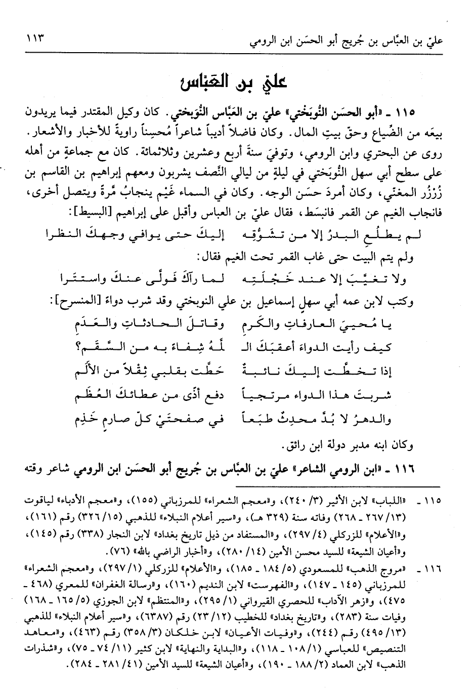 وَكَانَ فَاضلا أديباً شَاعِرًا محسناً راوية للْأَخْبَار والأشعار روى عَن البحتري وَابْن الرُّومِي وَتُوفِّي سنة أَربع وَعشْرين وَثَلَاث مائَة كَانَ مَعَ جمَاعَة من أَهله على سطح أبي سهل النوبختي فِي لَيْلَة من ليَالِي النّصْف يشربون وَمَعَهُمْ إِبْرَاهِيم بن الْقَاسِم بن زرزر الْمُغنِي وَكَانَ أَمْرَد حسن الْوَجْه وَكَانَ فِي السَّمَاء غيم ينجاب مرّة ويتصل أُخْرَى فانجاب الْغَيْم عَن الْقَمَر فانبسط فَقَالَ عَليّ بن الْعَبَّاس وَأَقْبل على إِبْرَاهِيم من الْبَسِيط