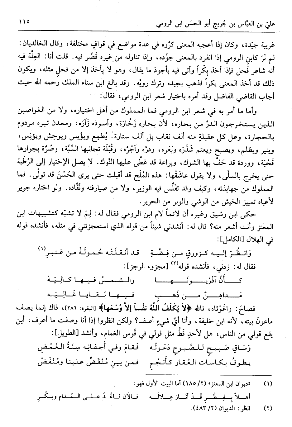 غَرِيبَة جَيِّدَة وَكَانَ إِذا أعجبه الْمَعْنى كَرَّرَه فِي عدَّة مَوَاضِع فِي قواف مُخْتَلفَة وَقَالَ الخالديان لم نر كَابْن الرُّومِي إِذا انْفَرد بِالْمَعْنَى جوده وَإِذا تنَاوله من غير قصر فِيهِ قلت أَنا الْعلَّة فِيهِ أَنه شَاعِر فَحل فَإِذا أَخذ بكرا جوده وأتى فِيهِ بأجود مَا يُقَال وَهُوَ لَا يَأْخُذ إِلَّا من فحلٍ مثله وَيكون ذَلِك قد أَخذ الْمَعْنى بكرا فَذهب بجيده وَترك رويه وَقد بَالغ ابْن سناء الْملك رَحمَه الله حَيْثُ أجَاب القَاضِي الْفَاضِل وَقد أمره بِاخْتِيَار شعر ابْن الرُّومِي فَقَالَ وَأما مَا أَمر بِهِ فِي شعر ابْن الرُّومِي فَمَا الْمَمْلُوك من أهل اخْتِيَاره وَلَا من الغواصين الَّذين يستخرجون الدّرّ من بحاره لِأَن بحاره زخارة وأسوده زآره ومعدن تبره مردوم بِالْحِجَارَةِ)