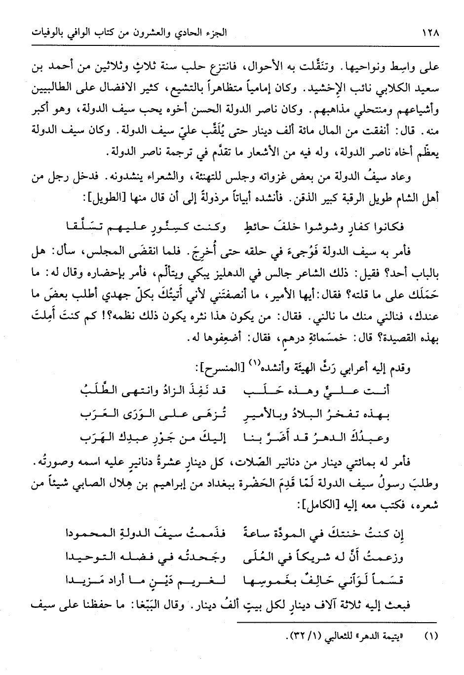 فَأمر لَهُ بِمِائَتي دِينَار من دَنَانِير الصلات كل دِينَار عشرَة دَنَانِير عَلَيْهِ اسْمه وَصورته وَطلب رَسُول سيف الدولة لما قدم الحضرة بِبَغْدَاد من إِبْرَاهِيم بن هِلَال الصابي شَيْئا من شعره فَكتب إِلَيْهِ من الْكَامِل