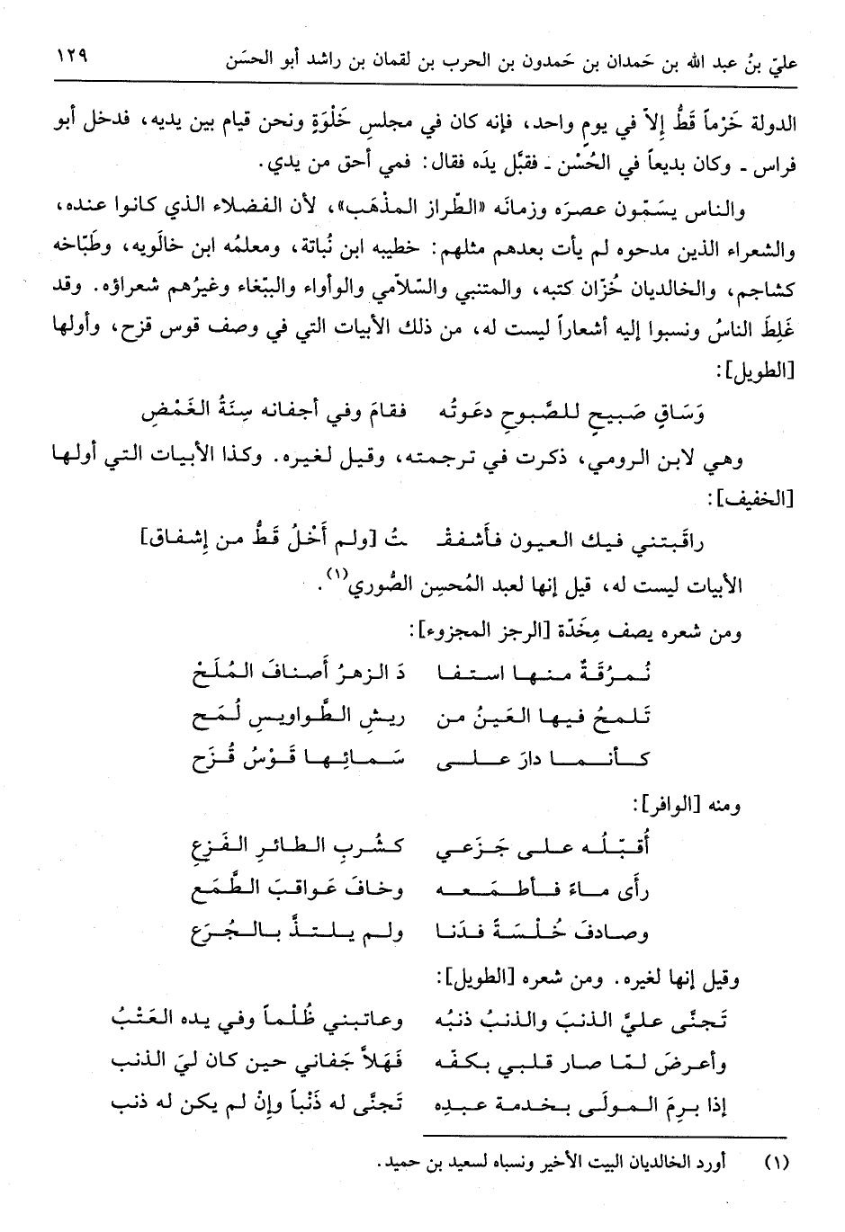 وَالنَّاس يسمون عصره وزمانه الطّراز الْمَذْهَب لِأَن الْفُضَلَاء الَّذِي كَانُوا عِنْده وَالشعرَاء الَّذين مدحوه لم يَأْتِ بعدهمْ مثلهم خَطِيبه ابْن نباتة ومعلمه ابْن خالويه وطباخه كشاجم والخالديان كتبه والمتنبي والسلامي والوأواء والببغاء وَغَيرهم شعراؤه وَقد غلط النَّاس ونسبوا إِلَيْهِ أشعاراً لَيست لَهُ من ذَلِك الأبيات الَّتِي فِي وصف قَوس قزَح وأولها من الطَّوِيل