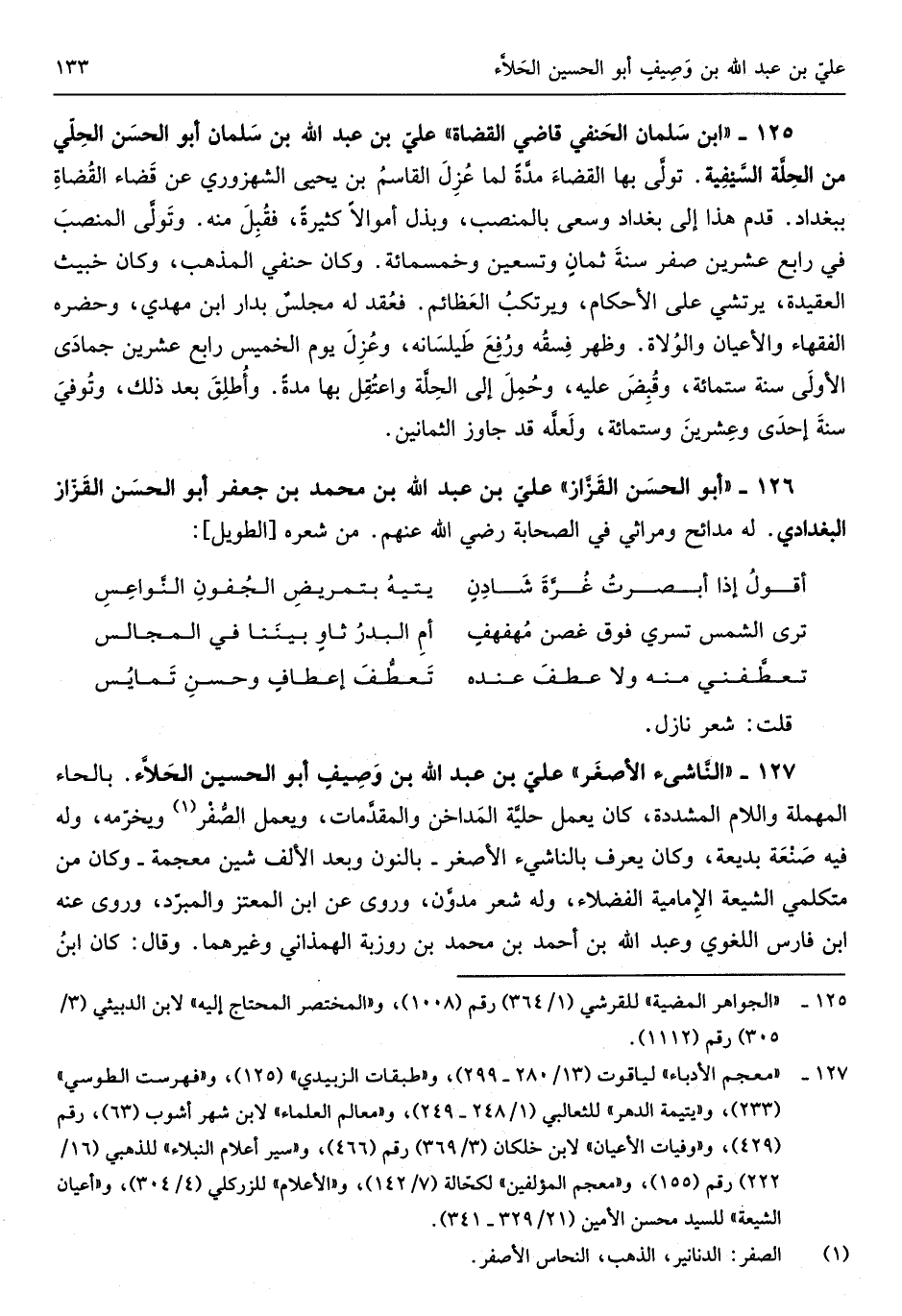 قلت شعر نَازل النَّاشِئ الْأَصْغَر عَليّ بن عبد الله بن وصيف أَبُو الْحُسَيْن الحلاء بِالْحَاء الْمُهْملَة وَاللَّام الْمُشَدّدَة كَانَ يعْمل حلية المداخن والمقدمات وَيعْمل الصفر ويخرمه وَله فِيهِ صَنْعَة بديعة وَكَانَ يعرف بالناشيء الْأَصْغَر بالنُّون وَبعد الْألف شين مُعْجمَة وَكَانَ من متكلمي الشِّيعَة الإمامية الْفُضَلَاء وَله شعر مدون وروى عَن ابْن المعتز والمبرد وروى عَنهُ ابْن فَارس اللّغَوِيّ وَعبد الله بن أَحْمد بن)