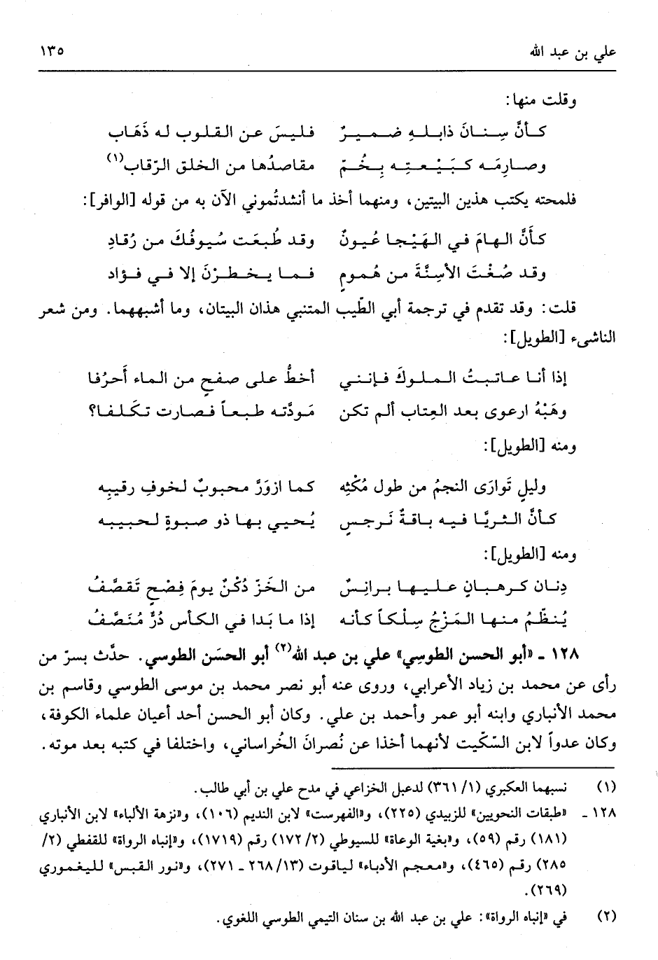 أَبُو الْحسن الطوسي عَليّ بن عبد الله أَبُو الْحسن الطوسي حدث بسر من رأى عَن مُحَمَّد بن زِيَاد الْأَعرَابِي وروى عَنهُ أَبُو نصر مُحَمَّد بن مُوسَى الطوسي وقاسم بن مُحَمَّد الْأَنْبَارِي وَابْنه عمر وَأحمد بن عَليّ وَكَانَ أَبُو الْحسن أحد أَعْيَان عُلَمَاء الْكُوفَة وَكَانَ عدوا لِابْنِ السّكيت لِأَنَّهُمَا أخذا عَن نصران الْخُرَاسَانِي وَاخْتلفَا فِي كتبه بعد مَوته