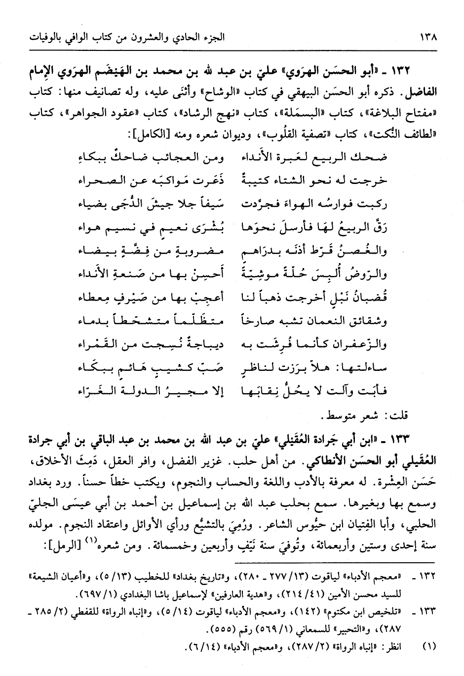 قلت شعر متوسط ابْن أبي جَرَادَة الْعقيلِيّ عَليّ بن عبد الله بن مُحَمَّد بن عبد الْبَاقِي بن أبي جَرَادَة الْعقيلِيّ أَبُو الْحسن الْأَنْطَاكِي من أهل حلب غزير الْفضل وافر الْعقل دمث الْأَخْلَاق حسن الْعشْرَة لَهُ معرفَة بالأدب واللغة والحساب والنجوم وَيكْتب خطا حسنا ورد بَغْدَاد وَسمع بهَا وبغيرها سمع بحلب عبد الله بن إِسْمَاعِيل بن أَحْمد بن أبي عِيسَى الْجَلِيّ الْحلَبِي وَأَبا الفتيان ابْن حيوس الشَّاعِر وَرمي بالتشيع ورأي الْأَوَائِل واعتقاد النُّجُوم مولده سنة إِحْدَى وَسِتِّينَ وَأَرْبع مائَة وَتُوفِّي سنة نَيف وَأَرْبَعين وَخمْس مائَة وَمن شعره من الرمل