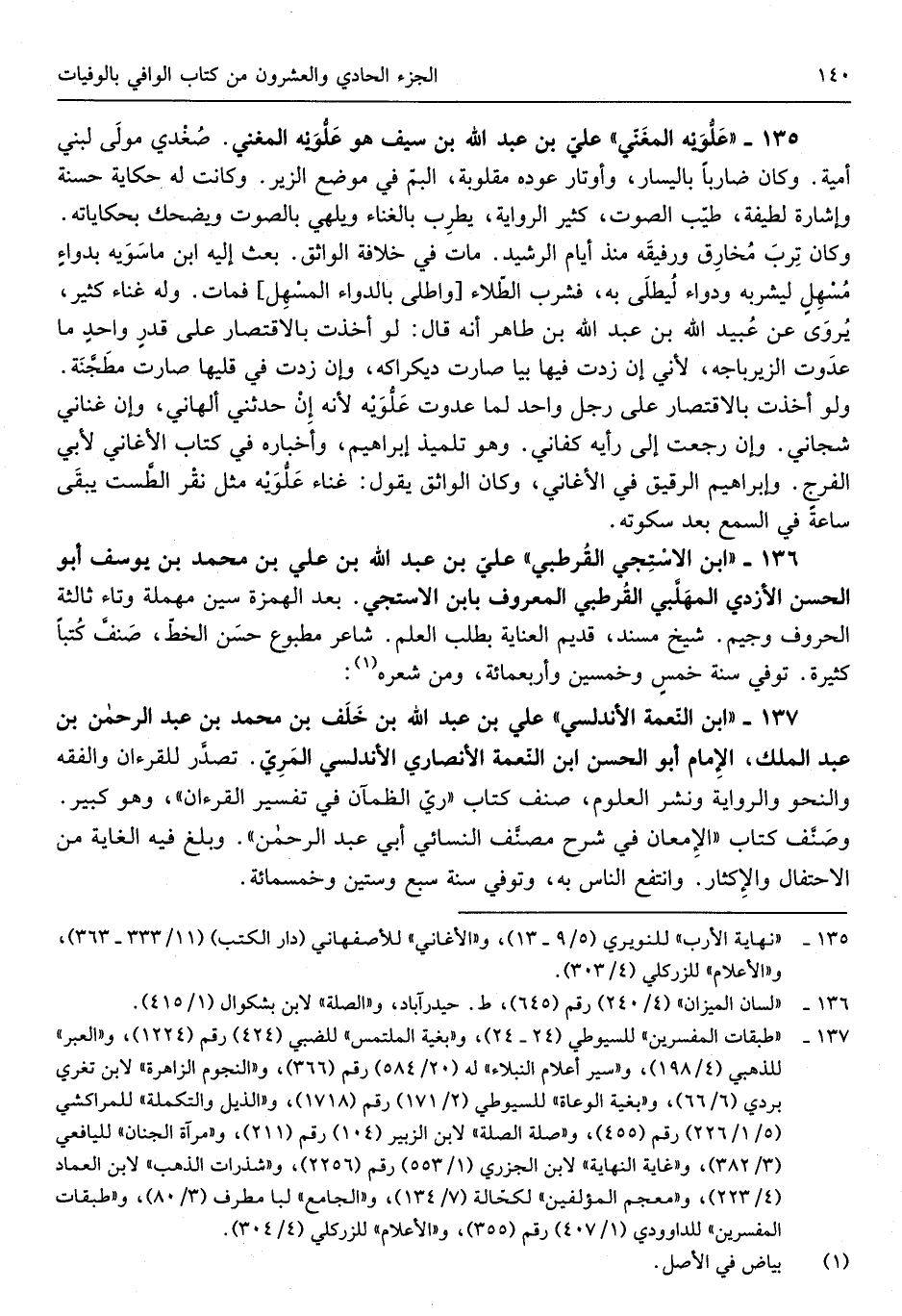 ابْن الاستجي الْقُرْطُبِيّ عَليّ بن عبد الله بن عَليّ بن مُحَمَّد بن يُوسُف أَبُو الْحسن الْأَزْدِيّ المهلبي الْقُرْطُبِيّ الْمَعْرُوف بِابْن الاستجي بعد الْهمزَة سين مُهْملَة وتاء ثَالِثَة الْحُرُوف وجيم شيخ مُسْند قديم الْعِنَايَة بِطَلَب الْعلم شَاعِر مطبوع حسن الْخط صنف كتبا كَثِيرَة توفّي سنة خمس وَخمسين وَأَرْبع مائَة وَمن شعره ابْن النِّعْمَة الأندلسي عَليّ بن عبد الله بن خلف بن مُحَمَّد بن عبد الرَّحْمَن بن عبد الْملك الإِمَام أَبُو الْحسن ابْن النِّعْمَة الْأنْصَارِيّ الأندلسي المري تصدر لِلْقُرْآنِ وَالْفِقْه والنحو وَالرِّوَايَة وَنشر الْعُلُوم صنف كتاب ري الظمآن فِي تَفْسِير الْقُرْآن وَهُوَ كَبِير وصنف كتاب الإمعان فِي شرح مُصَنف النَّسَائِيّ أبي عبد الرَّحْمَن وَبلغ فِيهِ الْغَايَة من الاحتفال والإكثار وانتفع النَّاس بِهِ وَتُوفِّي سنة سبع وَسِتِّينَ وَخمْس مائَة