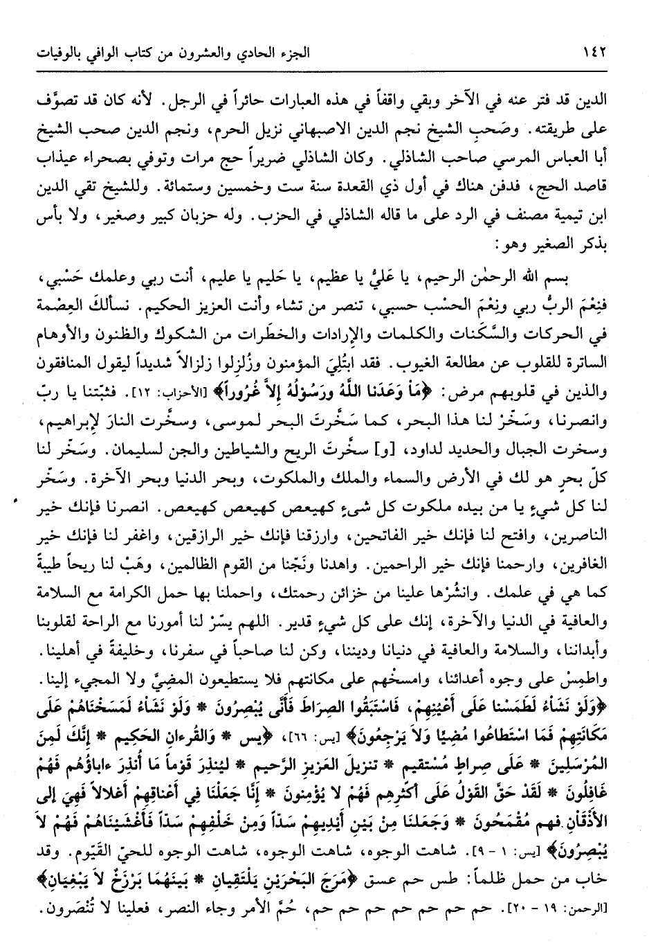 الدّين قد فتر عَنهُ فِي الآخر وَبَقِي وَاقِفًا فِي هَذِه الْعبارَات حائراً فِي الرجل لِأَنَّهُ كَانَ قد تصوف على طَرِيقَته وَصَحب الشَّيْخ نجم الدّين الاصبهاني نزيل الْحرم وَنجم الدّين صحب الشَّيْخ أَبَا الْعَبَّاس المرسي صَاحب الشاذلي وَكَانَ الشاذلي ضريراً حج مَرَّات وَتُوفِّي بصحراء عيذاب قَاصد الْحَج فَدفن هُنَاكَ فِي أول ذِي الْقعدَة سنة سِتّ وَخمسين وست مائَة وللشيخ تَقِيّ الدّين ابْن تَيْمِية مُصَنف فِي الرَّد على مَا قَالَه الشاذلي فِي الحزب وَله حزبان كَبِير وصغير وَلَا بَأْس بِذكر الصَّغِير وَهُوَ بِسم الله الرَّحْمَن الرَّحِيم يَا عَليّ يَا عَظِيم يَا حَلِيم يَا عليم أَنْت رَبِّي وعلمك حسبي فَنعم)