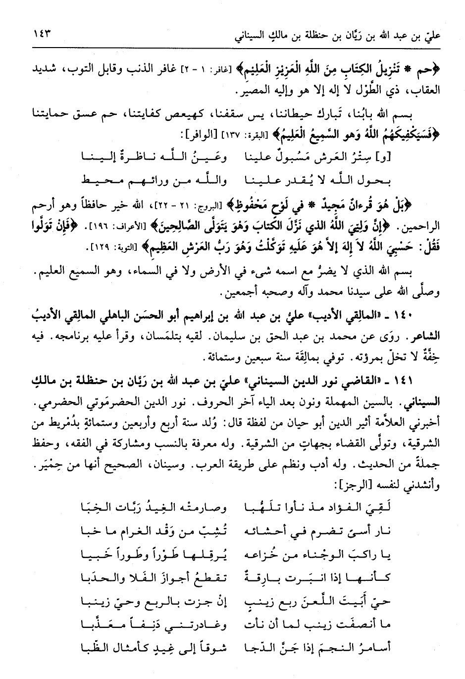 القَاضِي نور الدّين السينَانِي عَليّ بن عبد الله بن رَيَّان بن حَنْظَلَة بن مَالك السينَانِي بِالسِّين الْمُهْملَة وَنون بعد الْيَاء آخر الْحُرُوف نور الدّين الحضرموتي الْحَضْرَمِيّ أَخْبرنِي العلاّمة أثير الدّين أَبُو حَيَّان من لَفظه قَالَ ولد سنة أَربع وَأَرْبَعين وست مائَة بدمريط من الشرقية وَتَوَلَّى الْقَضَاء بجهات من الشرقية وَله معرفَة بِالنّسَبِ ومشاركة فِي الْفِقْه وَحفظ جملَة من الحَدِيث وَله أدب ونظم على طَريقَة الْعَرَب وسينان الصَّحِيح أَنَّهَا من حمير وأنشدني لنَفسِهِ من الرجز