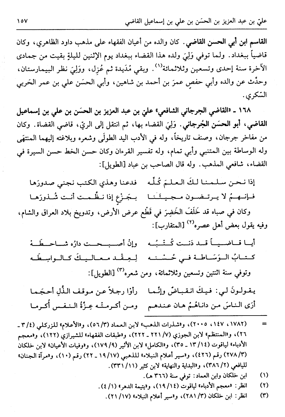 القَاضِي الْجِرْجَانِيّ الشَّافِعِي عَليّ بن عبد الْعَزِيز بن الْحسن بن عَليّ بن إِسْمَاعِيل القَاضِي أَبُو الْحسن الْجِرْجَانِيّ ولي الْقَضَاء بهَا ثمَّ انْتقل إِلَى الرّيّ قَاضِي الْقُضَاة وَكَانَ من مفاخر جرجان وصنف تَارِيخا وَله فِي الْأَدَب الْيَد الطُّولى وشعره وبلاغته إِلَيْهِمَا الْمُنْتَهى وَله الوساطة بَين المتنبي وَأبي تَمام وَله تَفْسِير الْقُرْآن وَكَانَ حسن الْخط حسن السِّيرَة فِي الْقَضَاء شَافِعِيّ الْمَذْهَب وَله قَالَ الصاحب بن عباد من الطَّوِيل
