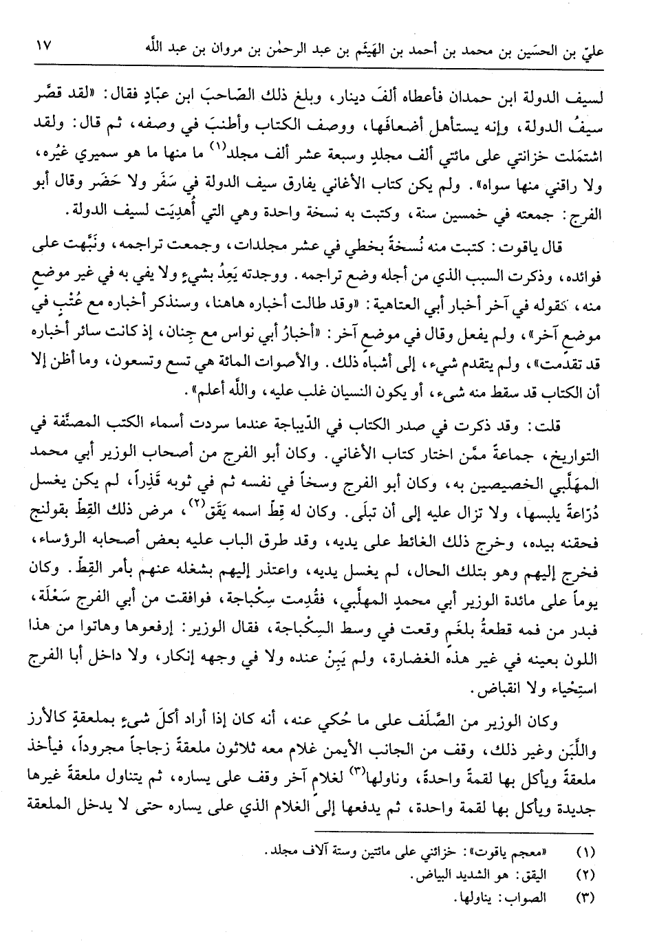 لسيف الدولة ابْن حمدَان فَأعْطَاهُ ألف دِينَار وَبلغ ذَلِك الصاحب ابْن عباد فَقَالَ لقد قصر سيف الدولة وَإنَّهُ يستاهل أضعافها وَوصف الْكتاب وَأَطْنَبَ فِي وَصفه ثمَّ قَالَ لقد اشْتَمَلت خزانتي على مِائَتي ألف مُجَلد وَسَبْعَة عشر ألف مُجَلد مَا مِنْهَا مَا هُوَ سميري غَيره وَلَا راقني مِنْهَا سواهُ وَلم يكن كتاب الأغاني يُفَارق سيف الدولة فِي سفر وَلَا حضر وَقَالَ أَبُو الْفرج جمعته فِي خمسين سنة وكتبت بِهِ نُسْخَة وَاحِدَة وَهِي الَّتِي أهديت لسيف الدولة