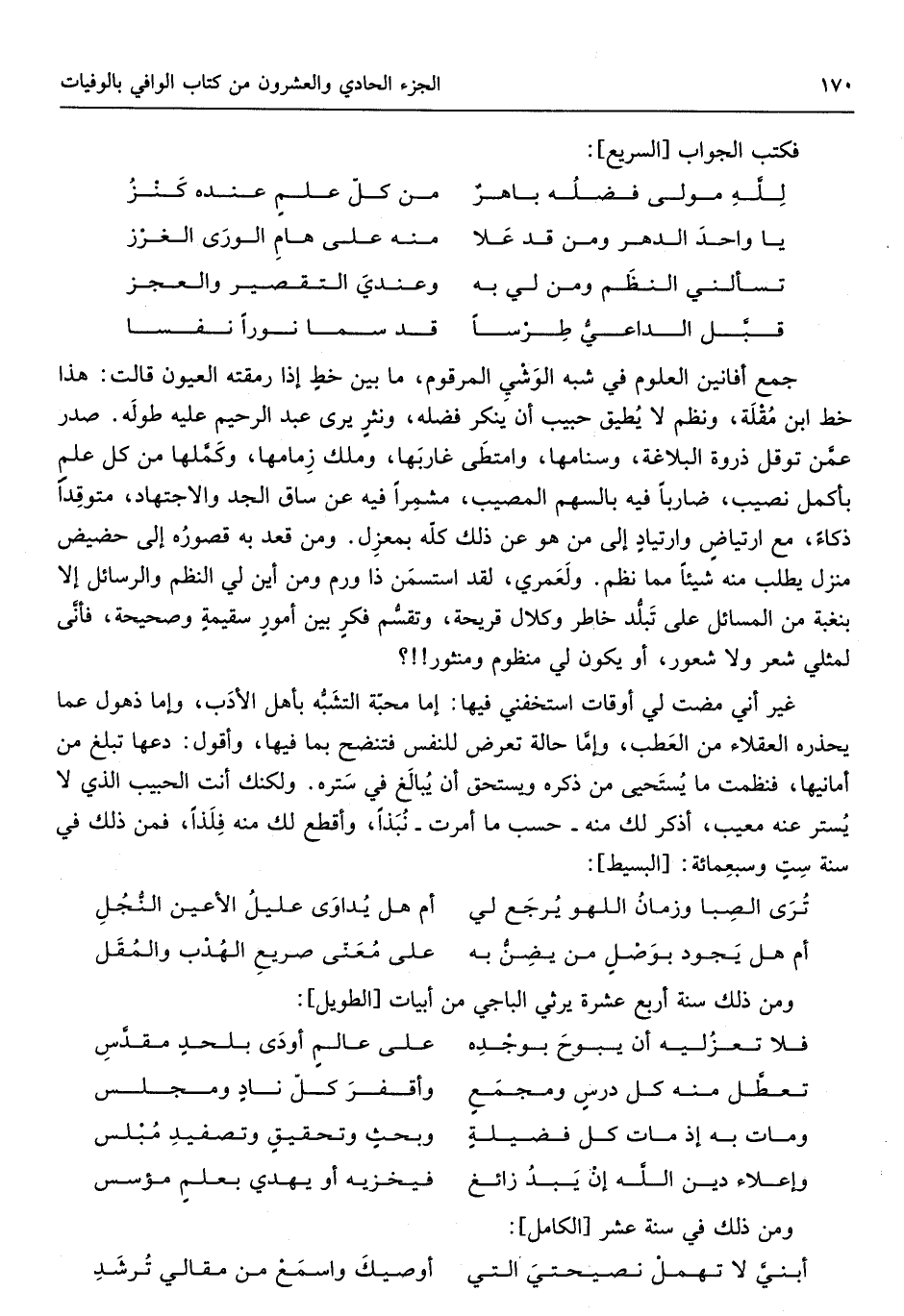 جمع أفانين الْعُلُوم فِي شبه الوشي المرقوم مَا بَين خطّ أذا رمقته الْعُيُون قَالَت هَذَا خطّ ابْن مقلة ونظم لَا يُطيق حبيب أَن يُنكر فَضله ونثر يرى عبد الرَّحِيم عَلَيْهِ طوله صدر عَمَّن توقل ذرْوَة البلاغة وسنامها وامتطى غاربها وَملك زمانها وكملها من كل علمٍ بأكمل نصيب ضَارِبًا فِيهِ بِالسَّهْمِ الْمُصِيب مشمراً فِيهِ عَن سَاق الْجد وَالِاجْتِهَاد متوقداً ذكاءً مَعَ ارتياض وارتياد إِلَى من هُوَ عَن ذَلِك كُله بمعزل وَمن قعد بِهِ قصوره إِلَى حضيض منزل يطْلب مِنْهُ شَيْئا مِمَّا نظم ولعمري لقد استسمن ذَا ورم وَمن أَيْن لي النّظم والرسائل إِلَّا بنغبة من الْمسَائِل على تبلد خاطر وكلال قريحة وتقسم فكر بَين أُمُور سقيمة وصحيحة فَأبى لمثلي شعر وَلَا شُعُور أَو يكون لي منظوم ومنثور غير أَنِّي مَضَت لي أَوْقَات استخفني فِيهَا إِمَّا محبَّة التَّشَبُّه بِأَهْل الْأَدَب وَإِمَّا ذُهُول عَمَّا يحذرهُ الْعُقَلَاء من العطب وَإِمَّا حَالَة تعرض للنَّفس فتنضح بِمَا فِيهَا وَأَقُول دعها تبلغ من أمانيها