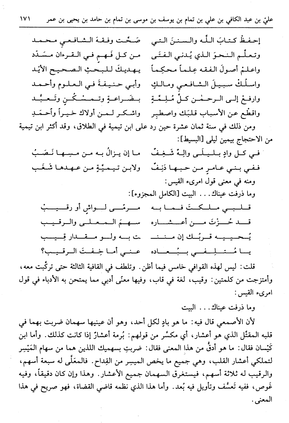 قلت لَيْسَ لهَذِهِ القوافي خَامِس فِيمَا أَظن وتلطف فِي القافية الثَّالِثَة حَتَّى تركبت مَعَه وأمتزجت من كَلِمَتَيْنِ وقيب لُغَة فِي قاب وفيهَا معنى أدبي مِمَّا يمْتَحن بِهِ الأدباء فِي قَول امْرِئ الْقَيْس وَمَا ذرفت عَيْنَاك الْبَيْت لِأَن الْأَصْمَعِي قَالَ فِيهِ مَا هُوَ باد لكل أحد وَهُوَ أَن عينيها سَهْمَان ضربت بهما فِي قلبه المقتل الَّذِي هُوَ أعشار أَي مكسر من قَوْلهم برمة أعشار إِذا كَانَت كَذَلِك وَأما ابْن كيسَان فَقَالَ مَا هُوَ أدق من هَذَا الْمَعْنى فَقَالَ ضربت بسهميك اللَّذين هما من سِهَام الميسر لتملكي أعشار الْقلب وَهِي جَمِيع مَا يخص الميسر من القداح فالمعلى لَهُ سَبْعَة أسْهم والرقيب لَهُ ثَلَاثَة أسْهم فيستغرق السهْمَان جَمِيع الأعشار وَهَذَا وَإِن كَانَ دَقِيقًا وَفِيه غوص فَفِيهِ تعسف وَتَأْويل فِيهِ بعد وَأما هَذَا الَّذِي نظمه قَاضِي الْقُضَاة فَهُوَ صَرِيح فِي هَذَا الْمَعْنى