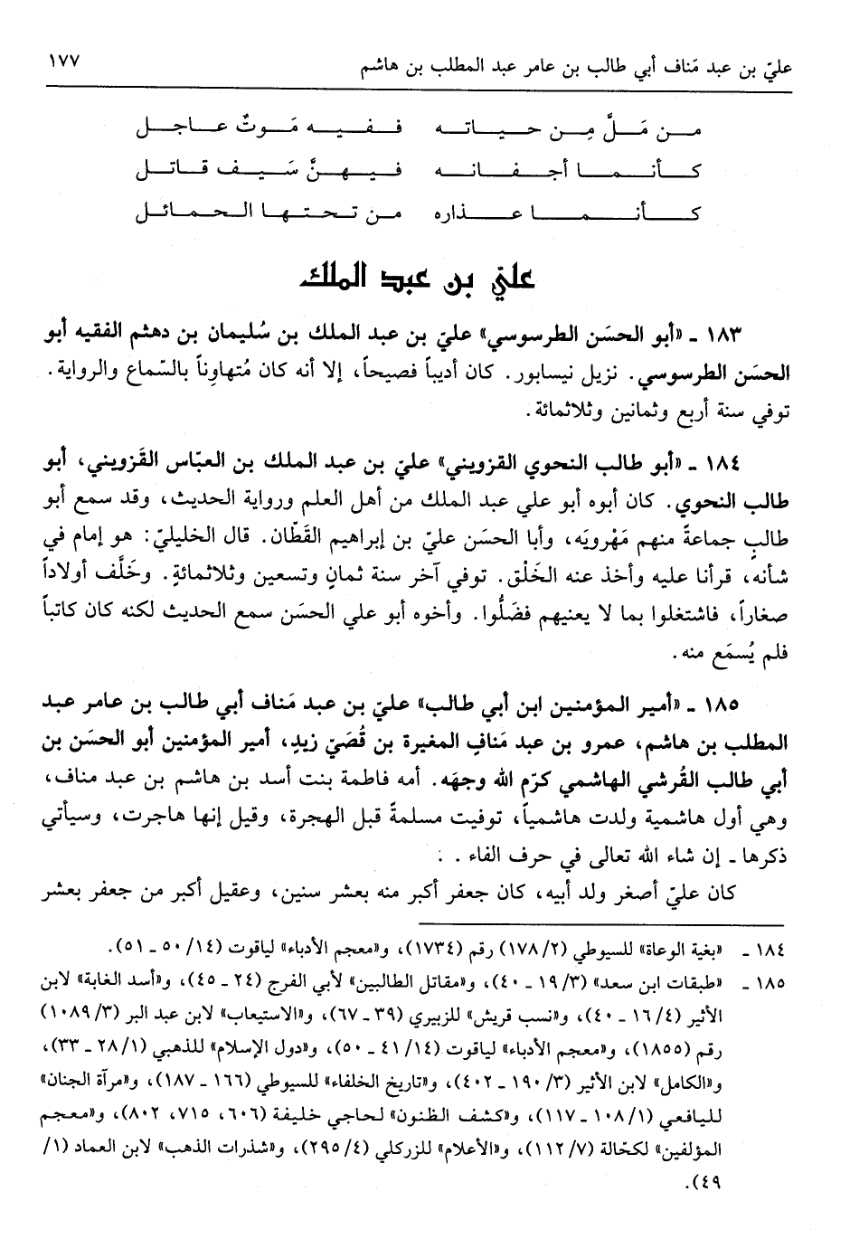 أَبُو طَالب النَّحْوِيّ الْقزْوِينِي عَليّ بن عبد الْملك بن الْعَبَّاس الْقزْوِينِي أَبُو طَالب النَّحْوِيّ كَانَ أَبوهُ أَبُو عَليّ عبد الْملك من أهل الْعلم وَرِوَايَة الحَدِيث وَقد سمع أَبُو طَالب جمَاعَة مِنْهُم مهرويه وَأَبا الْحسن عَليّ بن إِبْرَاهِيم الْقطَّان قَالَ الخليلي هُوَ إِمَام فِي شَأْنه قَرَأنَا عَلَيْهِ وَأخذ عَنهُ الْخلق توفّي آخر سنة ثَمَان وَتِسْعين وَثَلَاث مائَة وَخلف أَوْلَادًا صغَارًا فاشتغلوا بِمَا لَا يعنيهم فضلوا وَأَخُوهُ أَبُو عَليّ الْحسن سمع الحَدِيث لكنه كَانَ كَاتبا فَلم يسمع مِنْهُ