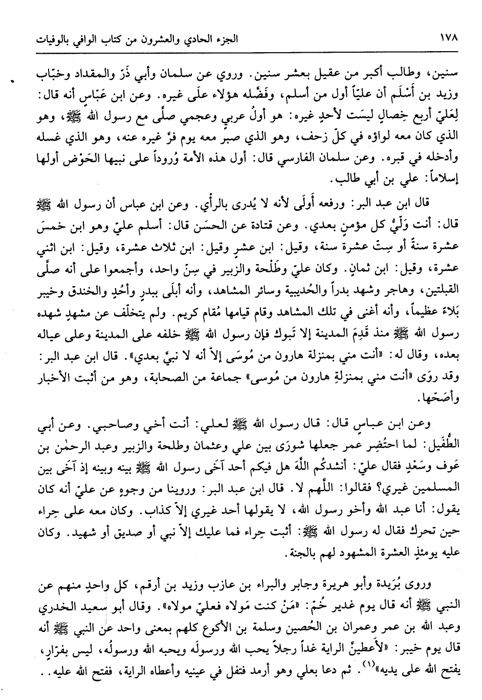 وروى بُرَيْدَة وَأَبُو هُرَيْرَة وَجَابِر والبراء بن عَازِب وَزيد بن أَرقم كل واحدٍ مِنْهُم عَن النَّبِي صلى الله عَلَيْهِ وَسلم أَنه قَالَ يَوْم غَدِير خم من كنت مَوْلَاهُ فعلي مَوْلَاهُ وَقَالَ أَبُو سعيد الْخُدْرِيّ وَعبد الله بن عمر وَعمْرَان بن الْحصين وَسَلَمَة بن الْأَكْوَع كلهم بِمَعْنى وَاحِد عَن النَّبِي صلى الله عَلَيْهِ وَسلم أَنه قَالَ يَوْم خَيْبَر لَأُعْطيَن الرَّايَة غَدا رجلا يحب الله وَرَسُوله وَيُحِبهُ الله وَرَسُوله لَيْسَ بفرارٍ يفتح الله على يَدَيْهِ ثمَّ دَعَا بعلي وَهُوَ أرمد فتفل فِي عَيْنَيْهِ وَأَعْطَاهُ الرَّايَة فَفتح الله عَلَيْهِ