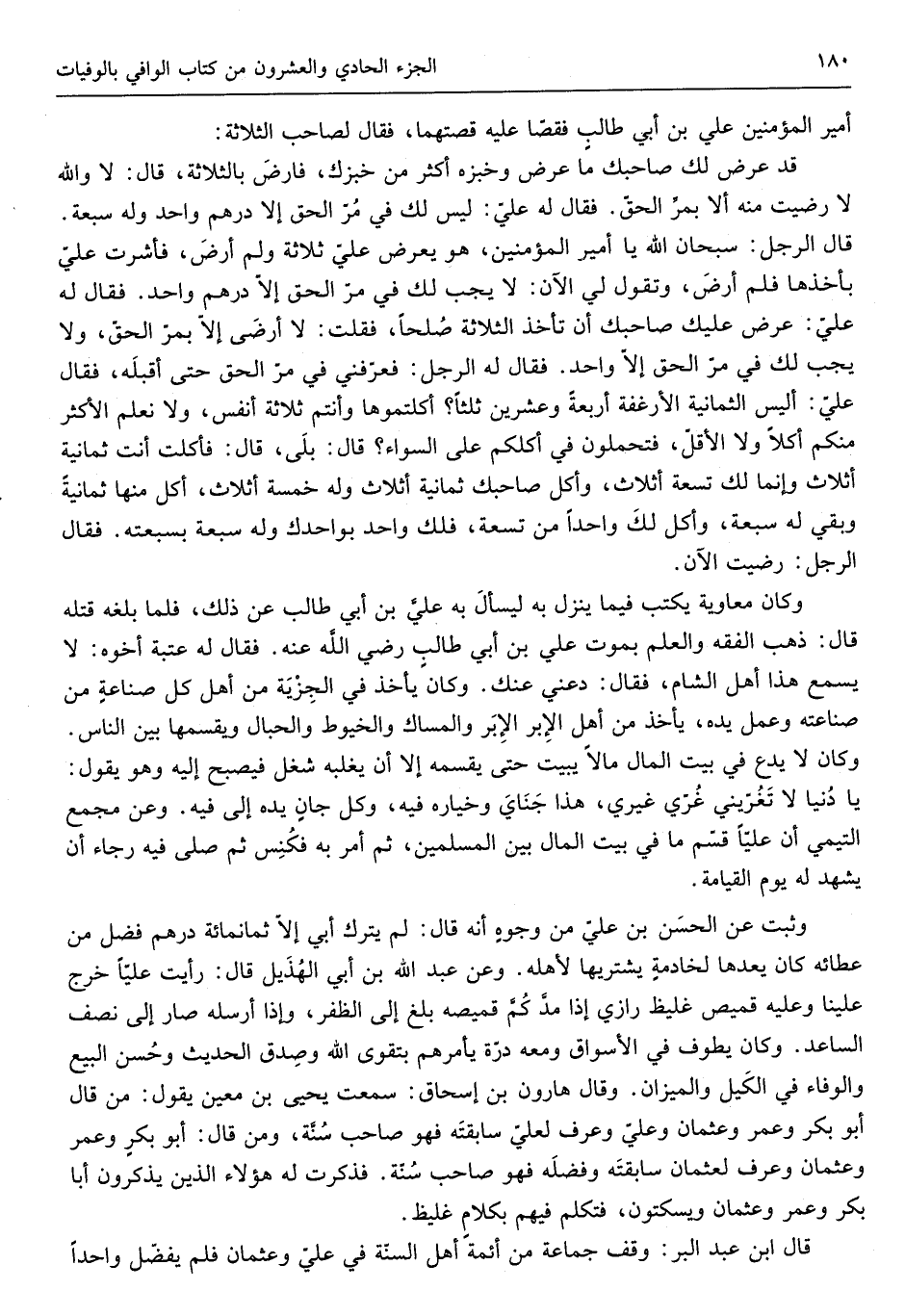 وَثَبت عَن الْحسن بن عَليّ من وُجُوه أَنه قَالَ لم يتْرك أبي إِلَّا ثمانماية دِرْهَم فضل من عطائه كَانَ يعدها لخادمةٍ يَشْتَرِيهَا لأَهله وَعَن عبد الله بن أبي الْهُذيْل قَالَ رَأَيْت عليا خرج علينا وَعَلِيهِ قَمِيص غليظ رازي إِذا مد كم قَمِيصه بلغ إِلَى الظفر وَإِذا أرْسلهُ صَار إِلَى نصف الساعد وَكَانَ يطوف فِي الْأَسْوَاق وَمَعَهُ درة يَأْمُرهُم بتقوى الله وَصدق الحَدِيث وَحسن البيع وَالْوَفَاء فِي الْكَيْل وَالْمِيزَان وَقَالَ هرون بن إِسْحَق سَمِعت يحيى بن معِين يَقُول من قَالَ أَبُو بكر وَعمر وَعُثْمَان وَعلي وَعرف لعَلي سابقته وفضله فَهُوَ صَاحب سنة وَمن قَالَ أَبُو بكرٍ وَعمر وَعُثْمَان وَعرف لعُثْمَان سابقته وفضله فَهُوَ صَاحب سنة فَذكرت لَهُ هَؤُلَاءِ الَّذين يذكرُونَ أَبَا بكر وَعمر وَعُثْمَان ويسكتون فَتكلم فيهم بِكَلَام غليظ