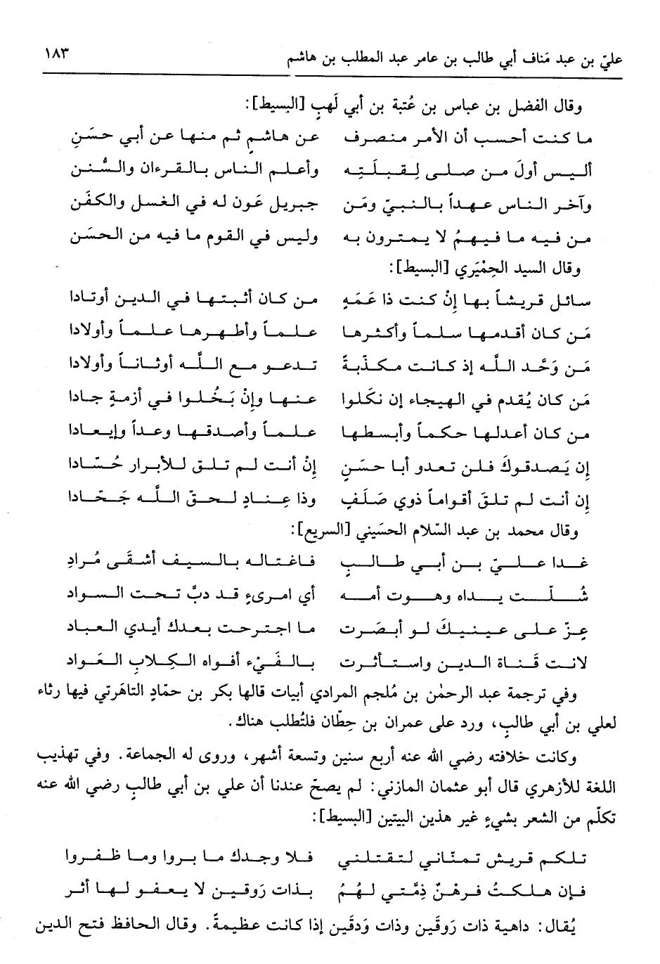وَفِي تَرْجَمَة عبد الرَّحْمَن بن ملجم الْمرَادِي أَبْيَات قَالَهَا بكر بن حَمَّاد التاهرتي فِيهَا رثاء لعَلي أبي طَالب ورد على عمرَان بن حطَّان فلتطلب هُنَاكَ وَكَانَت خِلَافَته رَضِي الله عَنهُ أَربع سِنِين وَتِسْعَة أشهر وروى لَهُ الْجَمَاعَة وَفِي تَهْذِيب اللُّغَة للأزهري قَالَ أَبُو عُثْمَان الْمَازِني لم يَصح عندنَا أَن عَليّ بن أبي طَالب رَضِي الله عَنهُ تكلم من الشّعْر بِشَيْء غير هذَيْن الْبَيْتَيْنِ من الْبَسِيط)