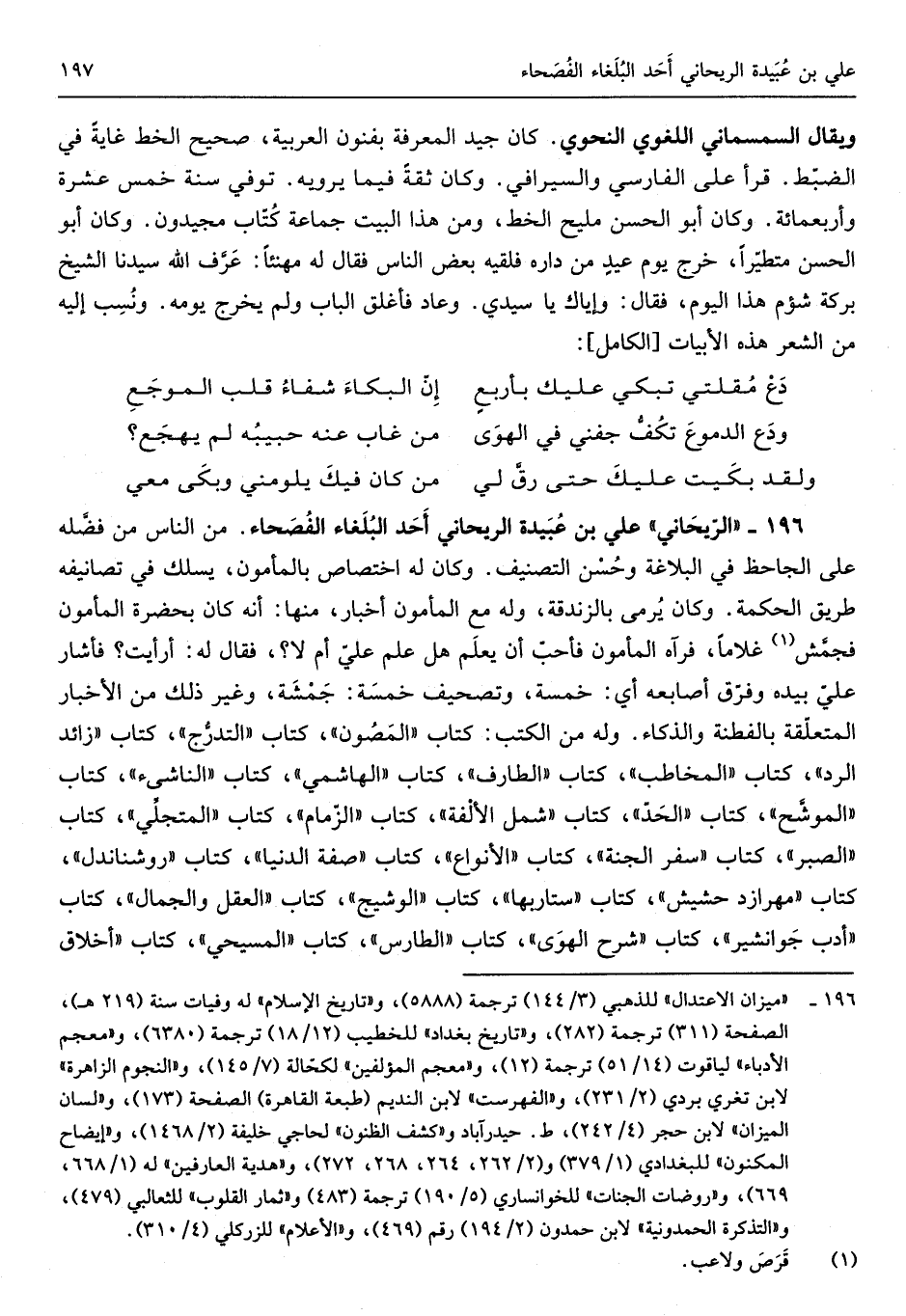 الريحاني عَليّ بن عُبَيْدَة الريحاني أحد البلغاء الفصحاء من النَّاس من فَضله على الجاحظ فِي البلاغة وَحسن التصنيف وَكَانَ لَهُ اخْتِصَاص بالمأمون يسْلك فِي تصانيفه طَرِيق الْحِكْمَة وَكَانَ يرْمى بالزندقة وَله مَعَ الْمَأْمُون أَخْبَار مِنْهَا أَنه كَانَ بِحَضْرَة الْمَأْمُون فجمش غُلَاما فَرَآهُ الْمَأْمُون فَأحب أَن يعلم هَل علم عَليّ أم لَا فَقَالَ لَهُ أَرَأَيْت فَأَشَارَ عَليّ بِيَدِهِ وَفرق أَصَابِعه أَي خَمْسَة وتصحيف خَمْسَة جمشة وَغير ذَلِك من الْأَخْبَار الْمُتَعَلّقَة بالفطنة والذكاء وَله من الْكتب كتاب المصون كتاب التدرج كتاب زَائِد الرَّد كتاب الْمُخَاطب كتاب الطارف)
