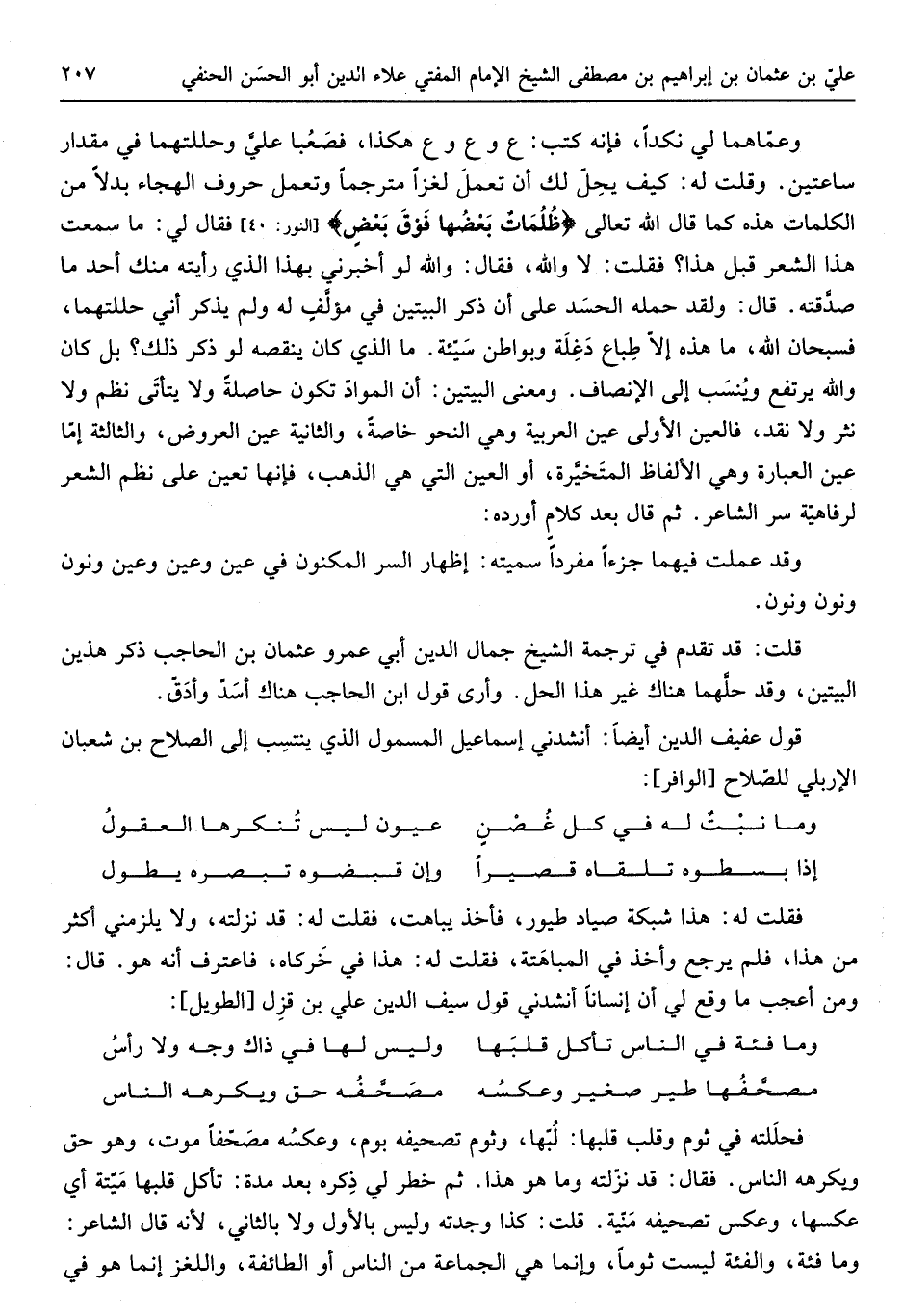 وعماهما لي نكداً فَإِنَّهُ كتب ع وع وع هَكَذَا فصعبا عَليّ وحللتهما فِي مِقْدَار ساعتين وَقلت لَهُ كَيفَ يحل لَك أَن يعْمل لغزاً مترجماً وتعمل حُرُوف الهجاء بَدَلا من الْكَلِمَات هَذِه كَمَا قَالَ الله تَعَالَى ظلمات بَعْضهَا فَوق بعض فَقَالَ لي مَا سَمِعت هَذَا الشّعْر قبل هَذَا فَقلت لَا)