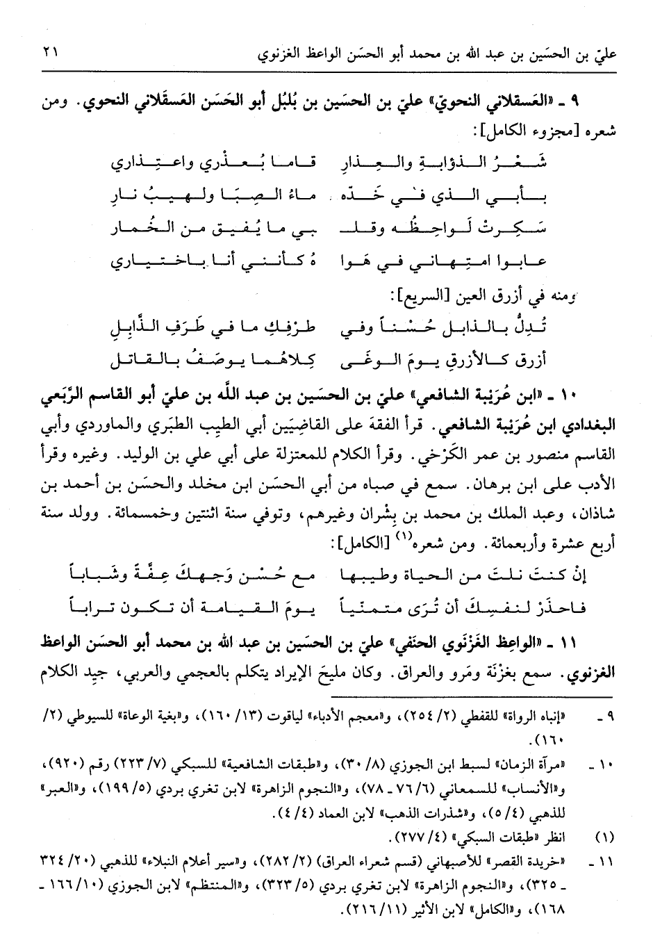 ابْن عريبة الشَّافِعِي عَليّ بن الْحُسَيْن بن عبد الله بن عَليّ أَبُو الْقَاسِم الربعِي الْبَغْدَادِيّ ابْن عريبة الشَّافِعِي قَرَأَ الْفِقْه على القاضيين أبي الطّيب الطَّبَرِيّ وَالْمَاوَرْدِيّ وَأبي الْقَاسِم مَنْصُور بن عمر الْكَرْخِي وَقَرَأَ الْكَلَام للمعتزلة على أبي عَليّ ابْن الْوَلِيد وَغَيره وَقَرَأَ الْأَدَب على ابْن برهَان وَسمع فِي صباه من أبي الْحسن ابْن مخلد وَالْحسن بن أَحْمد بن شَاذان وَعبد الْملك بن بَشرَان وَغَيرهم وَتُوفِّي سنة اثْنَتَيْنِ وَخمْس مائَة وَولد سنة أَربع عشرَة وَأَرْبع مائَة وَمن شعره من الْكَامِل