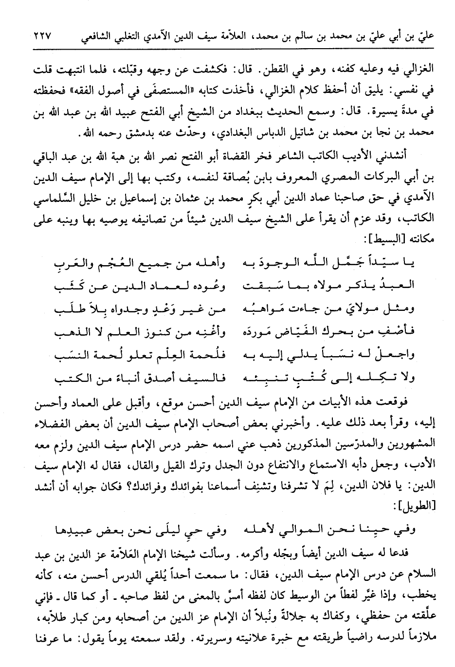 أَنْشدني الأديب الْكَاتِب الشَّاعِر فَخر الْقُضَاة أَبُو الْفَتْح نصر الله بن هبة الله بن عبد الْبَاقِي بن أبي البركات الْمصْرِيّ الْمَعْرُوف بِابْن بصاقة لنَفسِهِ وَكتب بهَا إِلَى الإِمَام سيف الدّين الْآمِدِيّ فِي حق صاحبنا عماد الدّين أبي بكر مُحَمَّد بن عُثْمَان بن إِسْمَاعِيل بن خَلِيل السَّلمَانِي الْكَاتِب وَقد عزم أَن يقْرَأ على الشَّيْخ سيف الدّين شَيْئا من تصانيفه يوصيه بهَا وينبهه على مكانته من الْبَسِيط
