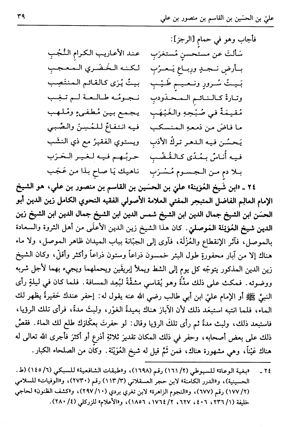 ابْن شيخ العوينة عَليّ بن الْحُسَيْن بن الْقَاسِم بن مَنْصُور بن عَليّ هُوَ الشَّيْخ الإِمَام الْعَالم الْفَاضِل المتبحر الْمُفْتِي الْعَلامَة الأصولي الْفَقِيه النَّحْوِيّ الْكَامِل زين الدّين أَبُو الْحسن ابْن الشَّيْخ جمال الدّين ابْن الشَّيْخ شمس الدّين ابْن الشَّيْخ جمال الدّين ابْن الشَّيْخ زين الدّين شيخ العوينة الْموصِلِي كَانَ هَذَا الشَّيْخ زين الدّين الْأَعْلَى من أهل الثروة والسعادة بالموصل فآثر الِانْقِطَاع وَالْعُزْلَة فأوى إِلَى الْجَبانَة بِبَاب الميدان ظَاهر الْموصل وَلَا مَاء هُنَاكَ إِلَّا من آبار محفورة طول الْبِئْر خَمْسُونَ ذِرَاعا وَسِتُّونَ ذِرَاعا وَأكْثر وَأَقل وَكَانَ الشَّيْخ زين الدّين الْمَذْكُور يتَوَجَّه كل يَوْم إِلَى الشط ويملأ إبريقين ويحملهما وَيَجِيء بهما لأجل شربه ووضوئه فَمَكثَ على ذَلِك مُدَّة وَهُوَ يقاسي مشقة لبعد الْمسَافَة فَلَمَّا كَانَ فِي لَيْلَة رأى النَّبِي صلى الله عَلَيْهِ وَسلم أَو الإِمَام عليّ بن أبي طَالب رَضِي الله عَنهُ يَقُول لَهُ إحفر عنْدك حفيرة يظْهر لَك المَاء فَلَمَّا انتبه استبعد ذَلِك لِأَن الْآبَار هُنَاكَ بعيدَة الْغَوْر ولبث مُدَّة فَرَأى تِلْكَ الرُّؤْيَا فاستبعد ذَلِك ولبث مُدَّة ثمَّ رأى تِلْكَ الرُّؤْيَا وَقَالَ لَو حفرت بعكازك طلع لَك المَاء فَقص ذَلِك على بعض أَصْحَابه وحفر فِي ذَلِك الْمَكَان تَقْدِير ثَلَاثَة أَذْرع أَو أَكثر فَأجرى الله تَعَالَى لَهُ هُنَاكَ عينا وَهِي مَشْهُورَة هُنَاكَ فَمن ثمَّ قيل لَهُ شيخ العوينة وَكَانَ من الصلحاء
