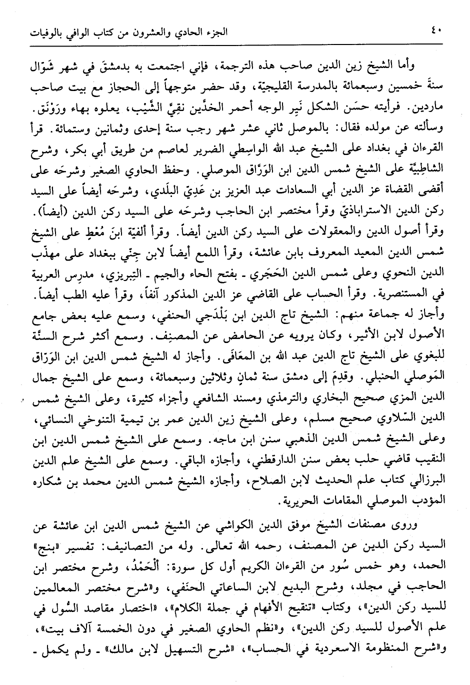 وَأما الشَّيْخ زين الدّين صَاحب هَذِه التَّرْجَمَة فَإِنِّي اجْتمعت بِهِ بِدِمَشْق فِي شهر شَوَّال سنة خمسين وَسبع مائَة بِالْمَدْرَسَةِ القليجية وَقد حضر مُتَوَجها إِلَى الْحجاز مَعَ بَيت صَاحب ماردين فرأيته حسن الشكل نير الْوَجْه أَحْمَر الْخَدين نقي الشيب يعلوه بهاء ورونق وَسَأَلته عَن مولده فَقَالَ بالموصل ثَانِي عشر شهر رَجَب سنة إِحْدَى وَثَمَانِينَ وست مائَة قَرَأَ الْقُرْآن فِي بَغْدَاد على الشَّيْخ عبد الله الوَاسِطِيّ الضَّرِير لعاصم من طَرِيق أبي بكر وَشرح الشاطبية على الشَّيْخ شمس الدّين ابْن الْوراق الْموصِلِي وَحفظ الْحَاوِي الصَّغِير وَشَرحه على أقضى الْقُضَاة عز الدّين أبي السعادات عبد الْعَزِيز بن عدي الْبَلَدِي وَشَرحه أَيْضا على السَّيِّد ركن الدّين أَيْضا وَقَرَأَ أصُول الدّين والمعقولات على السَّيِّد ركن الدّين أَيْضا وَقَرَأَ ألفية ابْن معط على الشَّيْخ شمس الدّين المعيد الْمَعْرُوف بِابْن عَائِشَة وَقَرَأَ اللمع أَيْضا لِابْنِ جني بِبَغْدَاد على مهذب الدّين النَّحْوِيّ وعَلى شمس الدّين الحجري بِفَتْح الْحَاء وَالْجِيم التبريزي مدرس الْعَرَبيَّة)