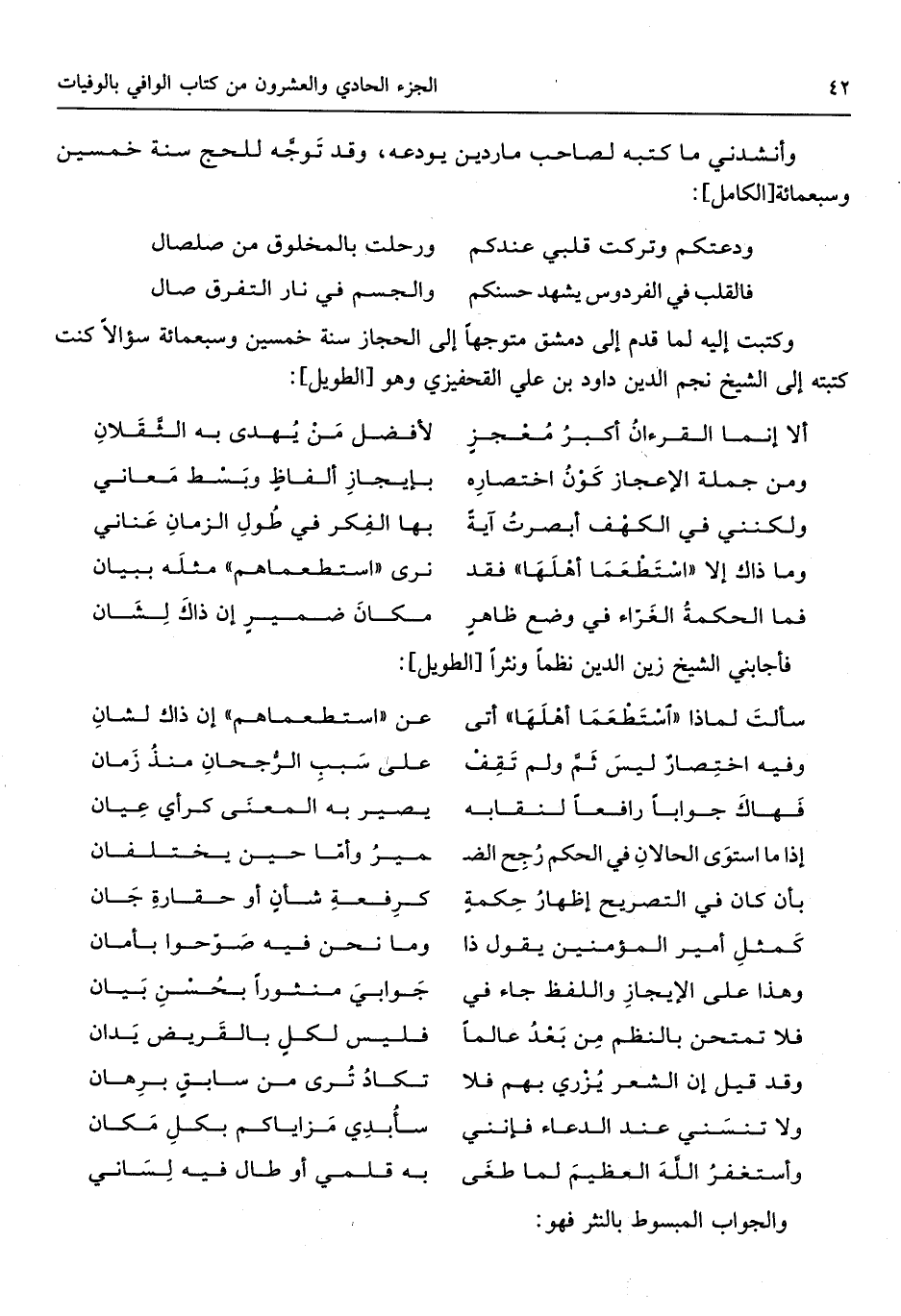 وكتبت إِلَيْهِ لما قدم إِلَى دمشق مُتَوَجها إِلَى الْحجاز سنة خمسين وَسبع مائَة سؤالاً كنت كتبته إِلَى الشَّيْخ نجم الدّين دَاوُد بن عَليّ القحفيزي وَهُوَ من الطَّوِيل