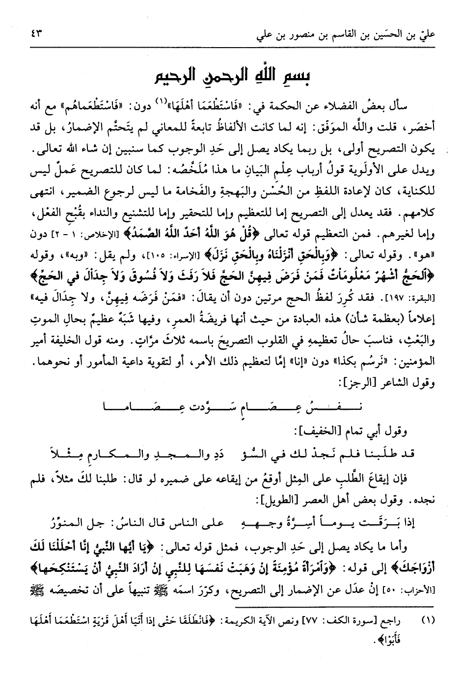 بِسم الله الرَّحْمَن الرَّحِيم سَأَلَ بعض الْفُضَلَاء عَن الْحِكْمَة فِي فَاسْتَطْعَمَا أَهلهَا دون فاستطعماهم مَعَ أَنه أخصر قلت وَالله الْمُوفق إِنَّه لما كَانَت الْأَلْفَاظ تَابِعَة للمعاني لم يتحتم الْإِضْمَار بل قد يكون التَّصْرِيح أولى بل رُبمَا يكَاد يصل إِلَى حد الْوُجُوب كَمَا سنبين إِن شَاءَ الله تَعَالَى وَيدل على الْأَوْلَوِيَّة قَول أَرْبَاب علم الْبَيَان مَا هَذَا ملخصه لما كَانَ للتصريح عمل لَيْسَ للكناية كَانَ إِعَادَة اللَّفْظ من الْحسن والبهجة والفخامة مَا لَيْسَ لرجوع الضَّمِير انْتهى كَلَامهم فقد يعدل إِلَى التَّصْرِيح إِمَّا للتعظيم وَإِمَّا للتحقير وَإِمَّا للتشنيع والنداء بقبح الْفِعْل وَإِمَّا لغَيرهم فَمن التَّعْظِيم قَوْله تَعَالَى قل هُوَ الله أحد الله الصَّمد دون هُوَ وَقَوله تَعَالَى وبالحق أَنزَلْنَاهُ وبالحق نزل وَلم يقل وَبِه وَقَوله الْحَج أشهر مَعْلُومَات فَمن فرض فِيهِنَّ الْحَج فَلَا رفث وَلَا فسوق وَلَا جِدَال فِي الْحَج فقد كرر لفظ الْحَج مرَّتَيْنِ دون أَن يُقَال فَمن فَرْضه فِيهِنَّ وَلَا جِدَال فِيهِ إعلاماً بعظامه صدلر هَذِه الْعِبَادَة من حَيْثُ أَنَّهَا فَرِيضَة الْعُمر وفيهَا شبه عَظِيم بِحَال الْمَوْت والبعث)