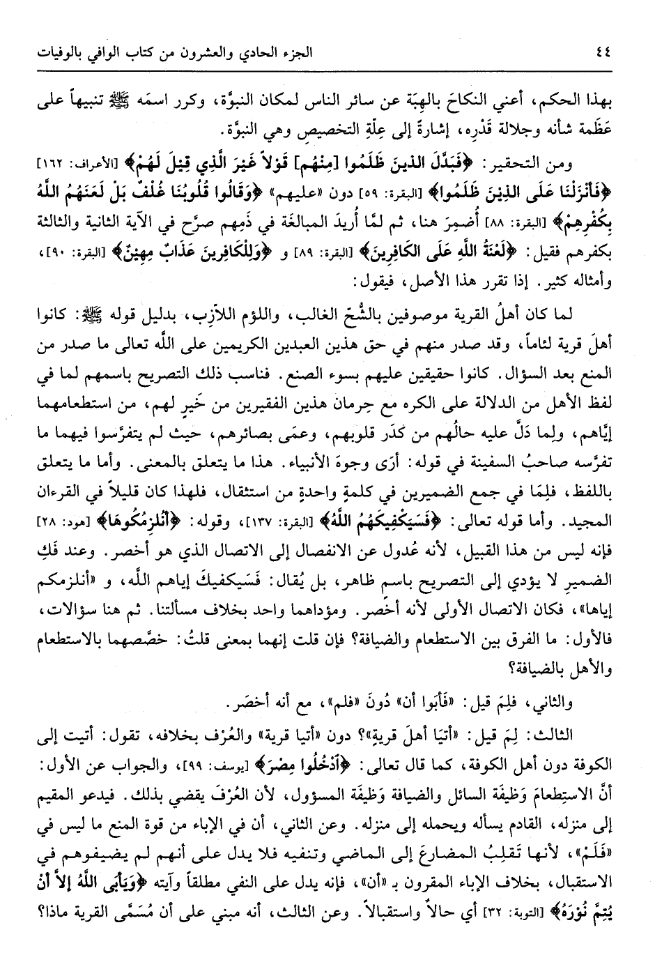 الثَّالِث لم قيل أَتَيَا أهل قَرْيَة دون أَتَيَا قَرْيَة وَالْعرْف بخلافة تَقول أتيت إِلَى الْكُوفَة دون أهل الْكُوفَة كَمَا قَالَ تَعَالَى ادخُلُوا مصر وَالْجَوَاب عَن الأول أَن الاستطعام وضيفة السَّائِل والضيافة وضيفة المسؤول لِأَن الْعرف يقْضِي بذلك فيدعو الْمُقِيم إِلَى منزله القادم يسْأَله ويحمله إِلَى منزله وَعَن الثَّانِي أَن فِي الإباء من قُوَّة الْمَنْع مَا لَيْسَ فِي فَلم لِأَنَّهَا تقلب الْمُضَارع إِلَى الْمَاضِي وسفيه فَلَا يدل على أَنهم لم يضيفوهم فِي الِاسْتِقْبَال بِخِلَاف الإباء المقرون ب أَن فَإِنَّهُ يدل على النَّفْي مُطلقًا وآبنه ويأبى الله إِلَّا أَن يتم نوره أَي حَالا واستقبالاً وَعَن الثَّالِث أَنه مَبْنِيّ على أَن مُسَمّى الْقرْيَة مَاذَا