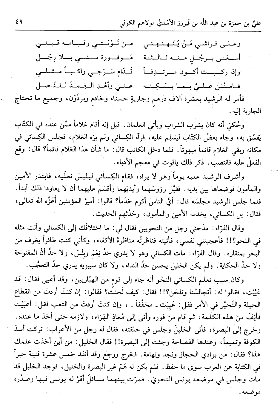 الْكَلِمَة ثمَّ قَامَ من فوره وأتى إِلَى معَاذ الهراء ولازمه حَتَّى أَخذ مَا عِنْده وَخرج إِلَى الْبَصْرَة فَأتى الْخَلِيل وَجلسَ فِي حلقته فَقَالَ لَهُ رجل من الْإِعْرَاب تركت أَسد الْكُوفَة وتميماً وَعِنْدهَا الفصاحة وَجئْت إِلَى الْبَصْرَة فَقَالَ الْخَلِيل من أَيْن أخذت علمك هَذَا فَقَالَ من بوادي الْحجاز ونجد وتهامة فَخرج وَرجع وَقد أنفذ خمس عشرَة قنينة حبرًا فِي الْكِتَابَة عَن الْعَرَب سوى مَا حفظ فَلم يكن لَهُ هم غير الْبَصْرَة والخليل فَوجدَ الْخَلِيل قد مَاتَ وَجلسَ فِي مَوْضِعه