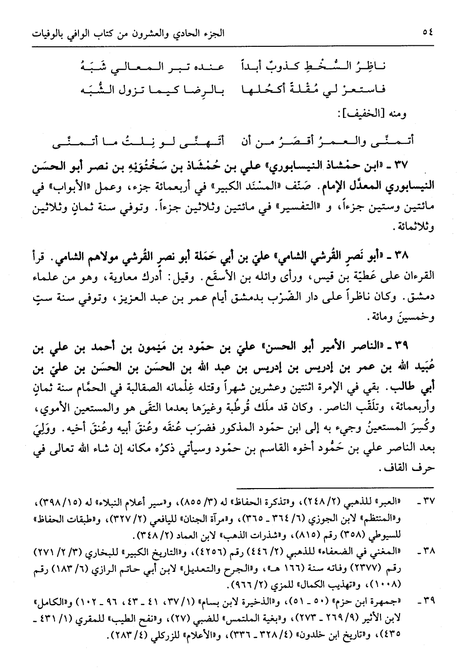 ابْن حمشاذ النَّيْسَابُورِي عَليّ بن حمشاذ بن سختويه بن نصر أَبُو الْحسن النَّيْسَابُورِي الْمعدل الإِمَام صنف الْمسند الْكَبِير فِي أَربع مائَة جُزْء وَعمل الْأَبْوَاب فِي مِائَتَيْنِ وَسِتِّينَ جُزْءا وَالتَّفْسِير فِي مِائَتَيْنِ وَثَلَاثِينَ جُزْءا وَتُوفِّي سنة ثَمَان وَثَلَاثِينَ وَثَلَاث مائَة