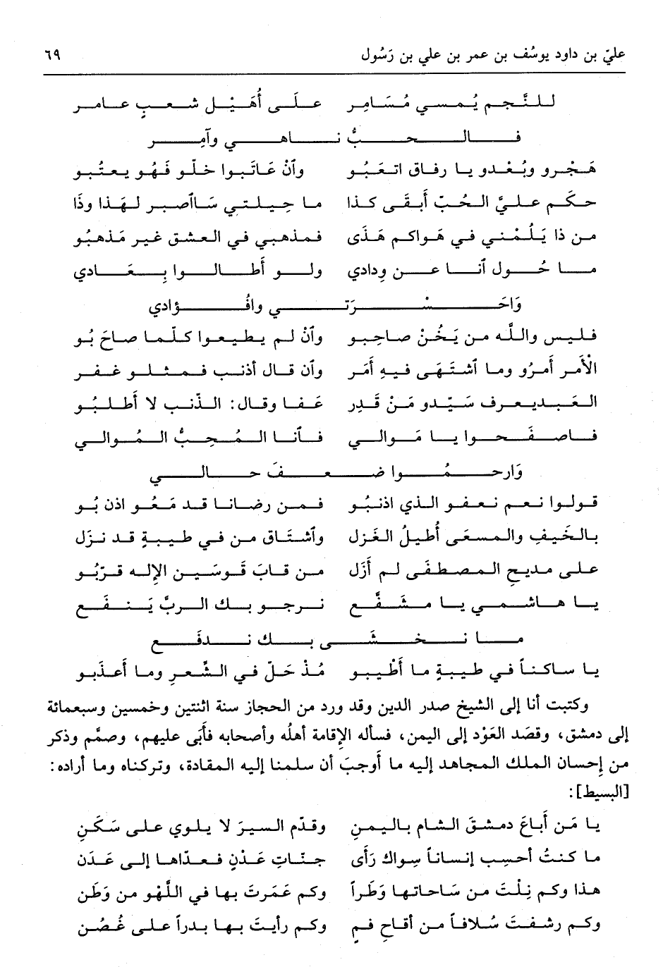 وكتبت أَنا إِلَى الشَّيْخ صدر الدّين وَقد ورد من الْحجاز سنة اثْنَتَيْنِ وَخمسين وَسبع مائَة إِلَى دمشق وَقصد الْعود إِلَى الْيمن فَسَأَلَهُ الْإِقَامَة أَهله وَأَصْحَابه فَأبى عَلَيْهِم وصمم وَذكر من إِحْسَان الْملك الْمُجَاهِد إِلَيْهِ مَا أوجب أَن أسلمنَا إِلَيْهِ المقادة وَتَرَكْنَاهُ وَمَا أَرَادَهُ من الْبَسِيط)