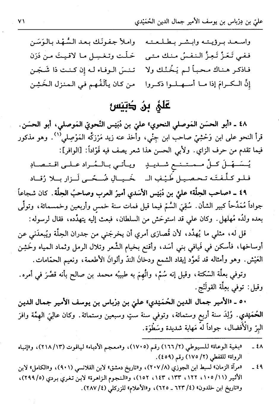 أَبُو الْحسن الْموصِلِي النَّحْوِيّ عَليّ بن دبيس النَّحْوِيّ الْموصِلِي أَبُو الْحسن قَرَأَ النَّحْو على ابْن وَحشِي صَاحب ابْن جني وَأخذ عَنهُ زيد مرزكه الْموصِلِي وَهُوَ مَذْكُور فِيمَا تقدم من حرف الزَّاي وَلأبي الْحسن هَذَا شعر يصف فِيهِ قواداً من الوافر