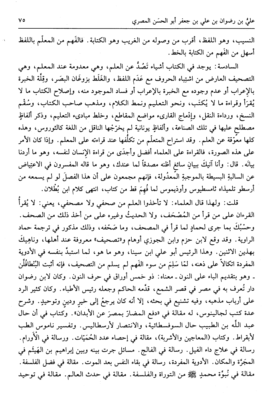 قلت وَلِهَذَا قَالَ الْعلمَاء لَا تَأْخُذُوا الْعلم من صحفي وَلَا مصحفي يَعْنِي لَا يقْرَأ الْقُرْآن على من قَرَأَ من الْمُصحف وَلَا الحَدِيث وَغَيره على من أَخذ ذَلِك من الصُّحُف وحسبك بِمَا جرى لحماد لما قَرَأَ فِي الْمُصحف وَمَا صحفه وَذَلِكَ مَذْكُور فِي تَرْجَمَة حَمَّاد الراوية وَقد وَقع لِابْنِ حزم وَابْن الْجَوْزِيّ أَوْهَام وتصحيف مَعْرُوفَة عِنْد أَهلهَا وناهيك بِهَذَيْنِ الِاثْنَيْنِ وَهَذَا الرئيس أَبُو عَليّ ابْن سينا وَهُوَ مَا هُوَ لما استبد بِنَفسِهِ فِي الْأَدْوِيَة المفردة اتكالاً على ذهنه لما سلم من سوء الْفَهم لم يسلم من التَّصْحِيف فَإِنَّهُ أثبت البنطافلن وَهُوَ بِتَقْدِيم الْبَاء على النُّون وَمَعْنَاهُ ذُو خمس أوراق فِي حرف النُّون وَكَانَ لِابْنِ رضوَان دَار تعرف بِهِ فِي مصر فِي قصر الشمع قدمه الْحَاكِم وَجعله رَئِيس الْأَطِبَّاء وَكَانَ كثير الرَّد على أَرْبَاب مذْهبه وَفِيه تشنيع فِي بَحثه إِلَّا أَنه كَانَ يرجع إِلَى خير وَدين وتوحيد وَشرح عدَّة كتب لِجَالِينُوسَ وَله مقَالَة فِي دفع المضار بِمصْر عَن الْأَبدَان وَكتاب فِي أَن حَال عبد الله بن الطَّبِيب حَال السوفسطائية والانتصار لأرسطاليس وَتَفْسِير ناموس الطِّبّ لأبقراط وَكتاب المعاجين والأشربة مقَالَة فِي إحصاء عدد الحميات ورسالة فِي الأورام رِسَالَة فِي علاج دَاء الْفِيل