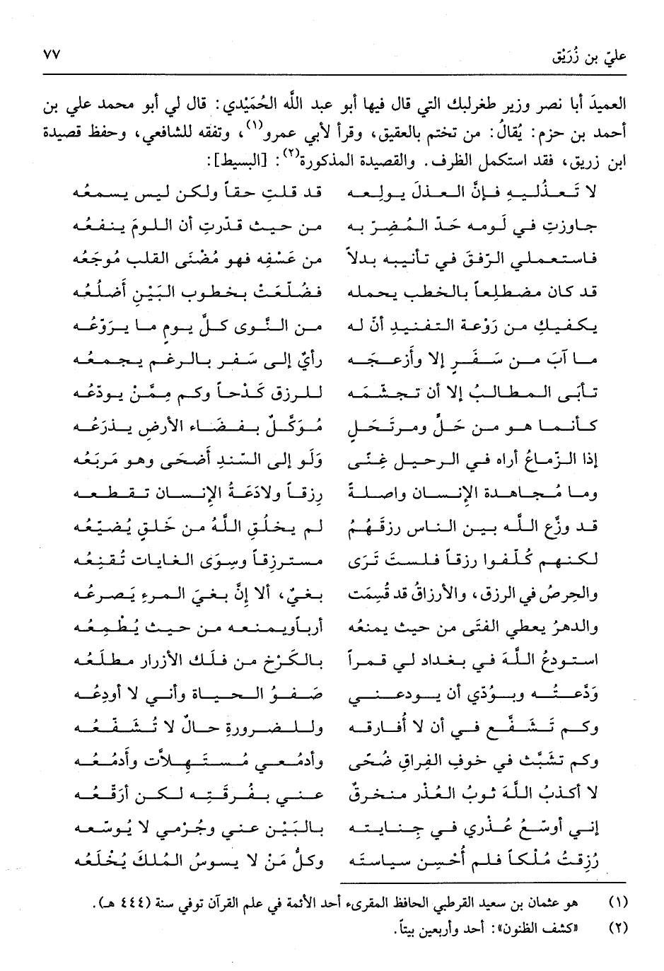 العميد أَبَا نصر وَزِير طغرلبك الَّتِي قَالَ فِيهَا أَبُو عبد الله الْحميدِي قَالَ لي أَبُو مُحَمَّد عَليّ بن أَحْمد ابْن حزم يُقَال من تختم بالعقيق وَقَرَأَ لأبي عَمْرو وتفقه للشَّافِعِيّ وَحفظ قصيدة ابْن زُرَيْق فقد اسيتكمل الظّرْف
