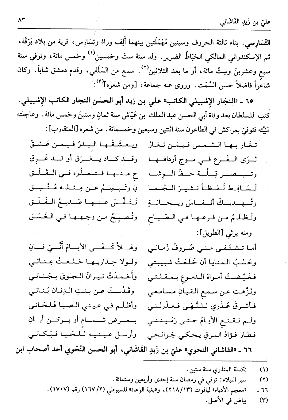 وروى عَنهُ جمَاعَة وَمن شعره النجار الإشبيلي الْكَاتِب عَليّ بن زيد أَبُو الْحسن النجار الْكَاتِب الإشبيلي كتب للسُّلْطَان بعد وَفَاة أبي الْحسن عبد الْملك بن عَيَّاش سنة ثَمَان وَسِتِّينَ وَخمْس مائَة وعاجلته منيته فَتوفي بمراكش فِي الطَّاعُون سنة اثْنَتَيْنِ وَسبعين وَخمْس مائَة من شعره من المتقارب